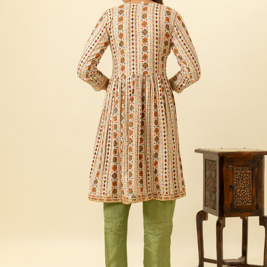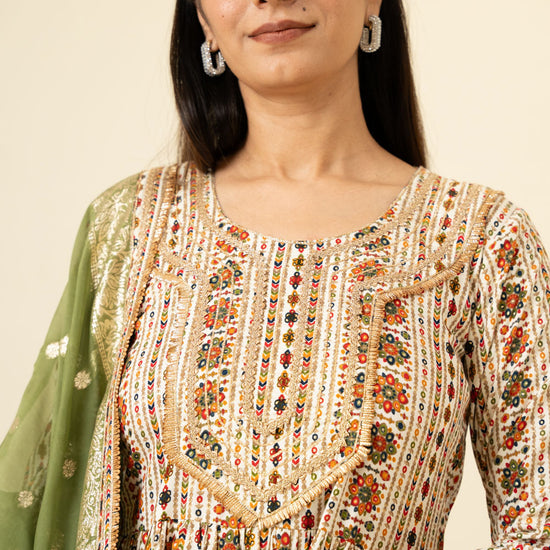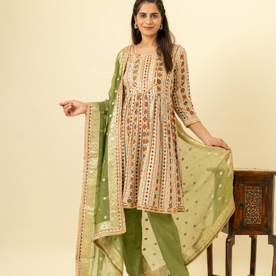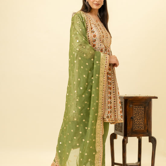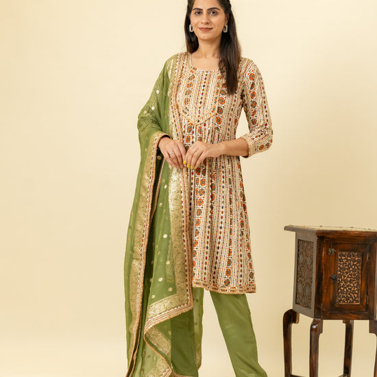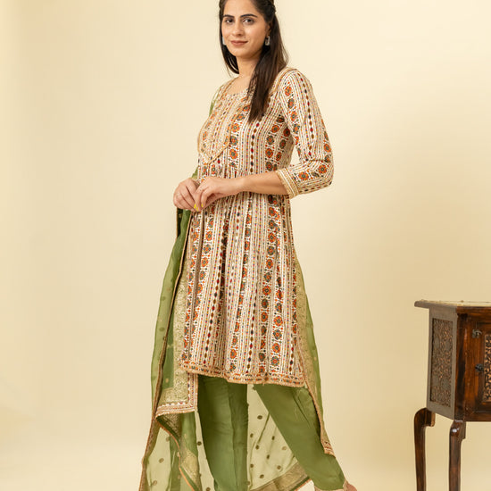 Panna Tussar Cotton Readymade Suit And Pant With Organza Dupatta