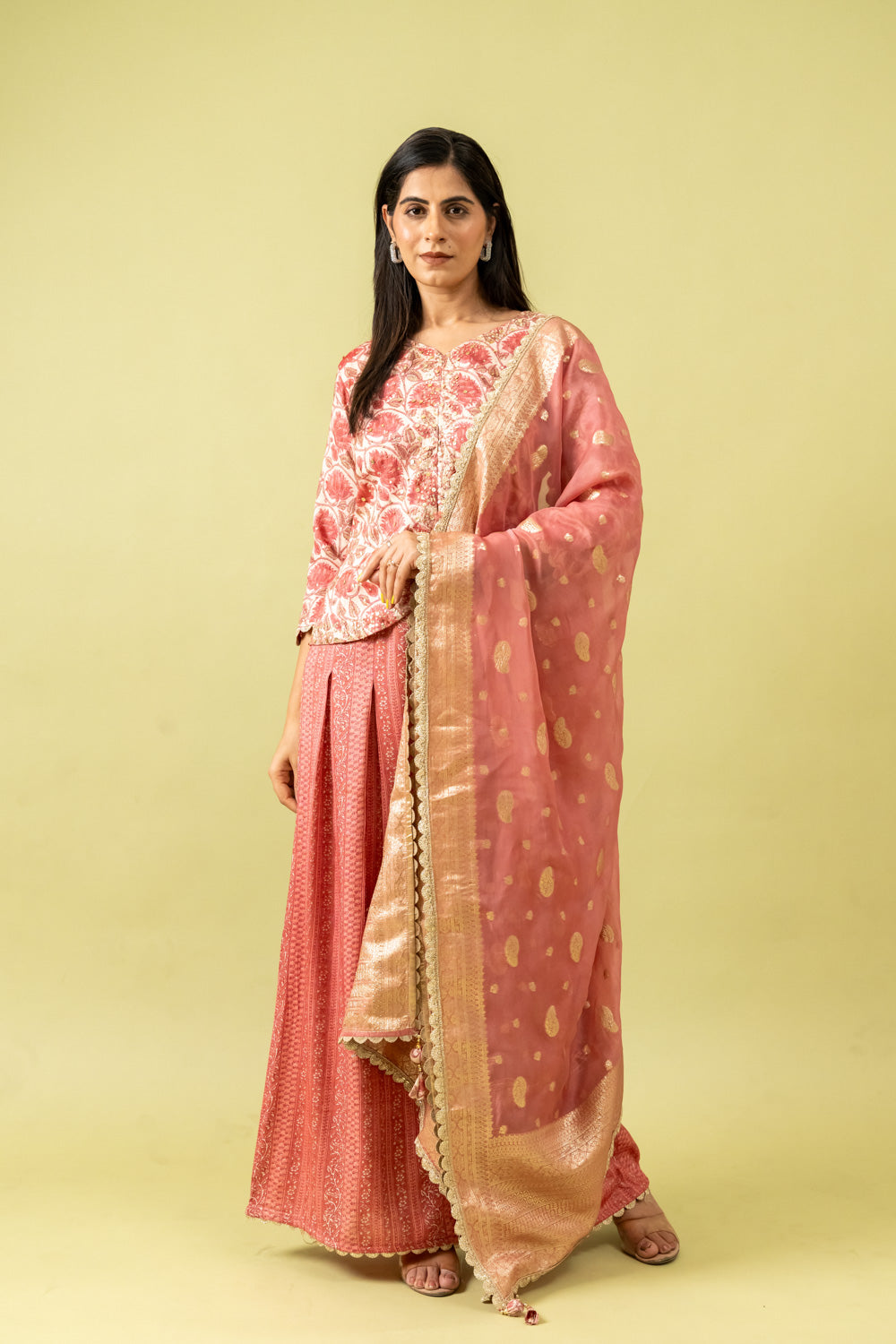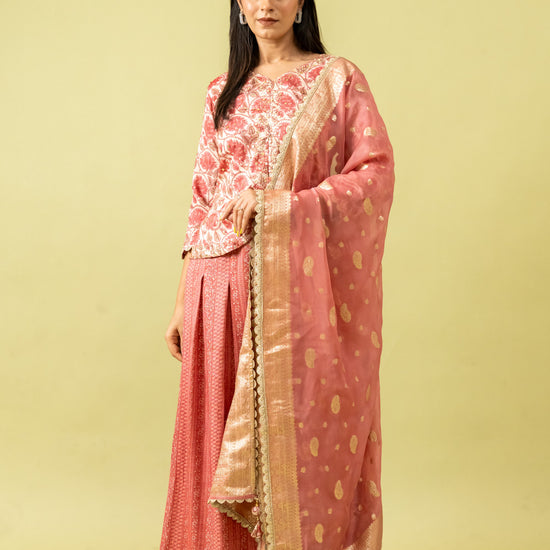 Panna Dark Gajari Cotton Readymade Suit And Palazzo With Organza Dupatta