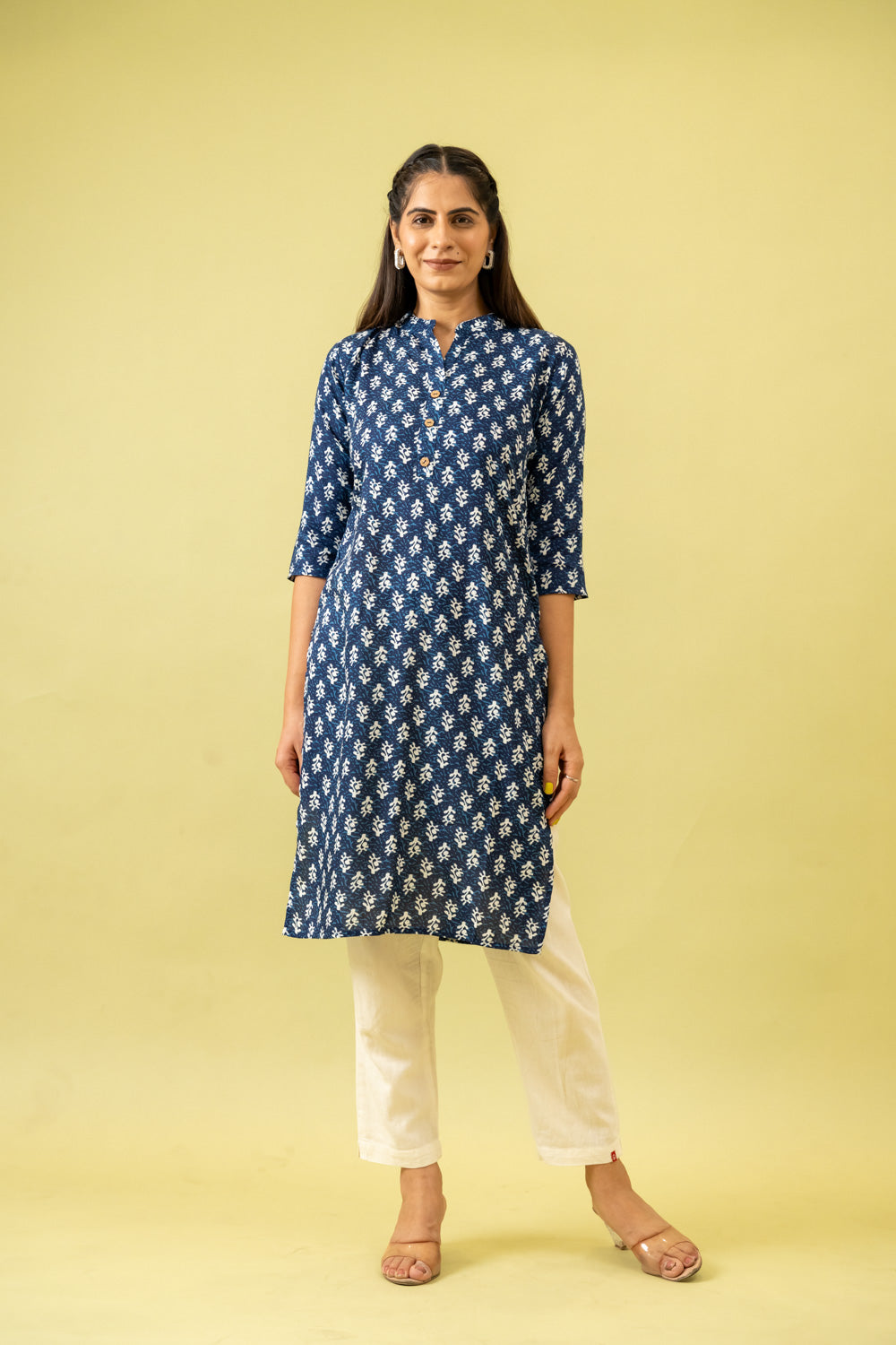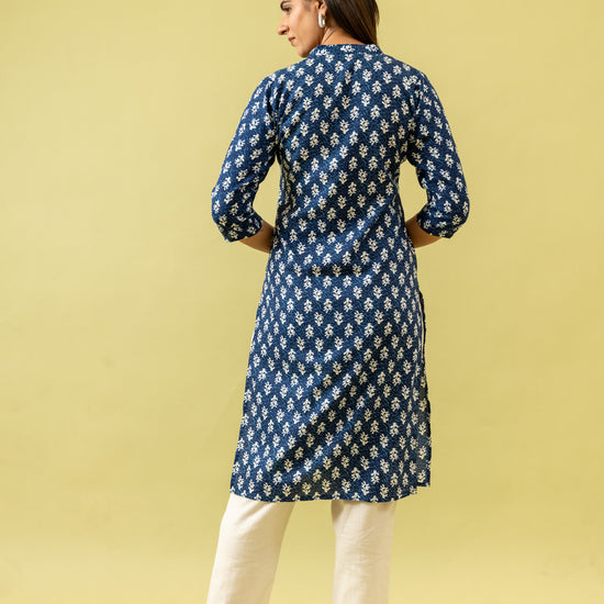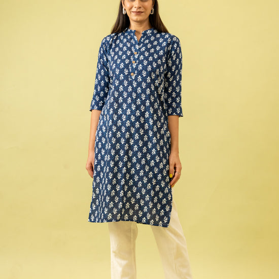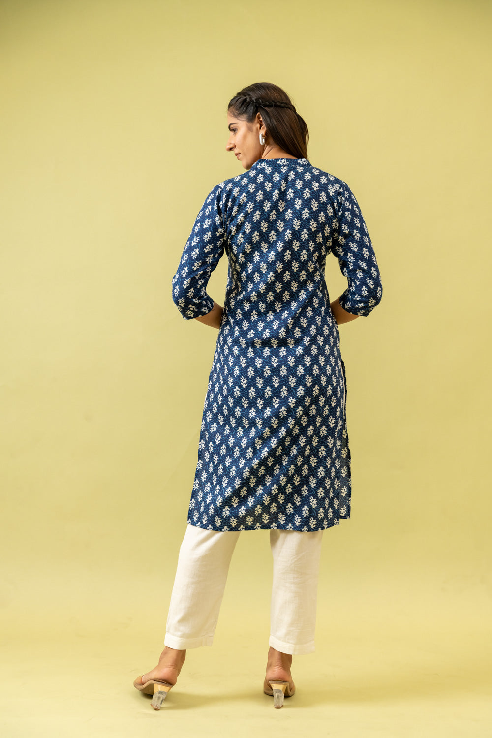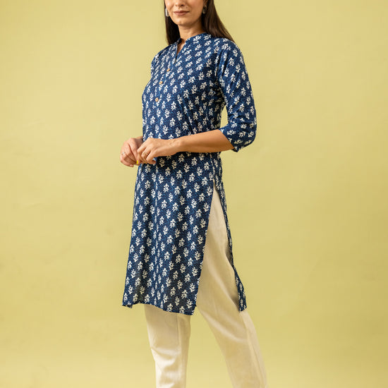 Panna Indigo Blue Floral Printed Cotton Readymade Long Kurta