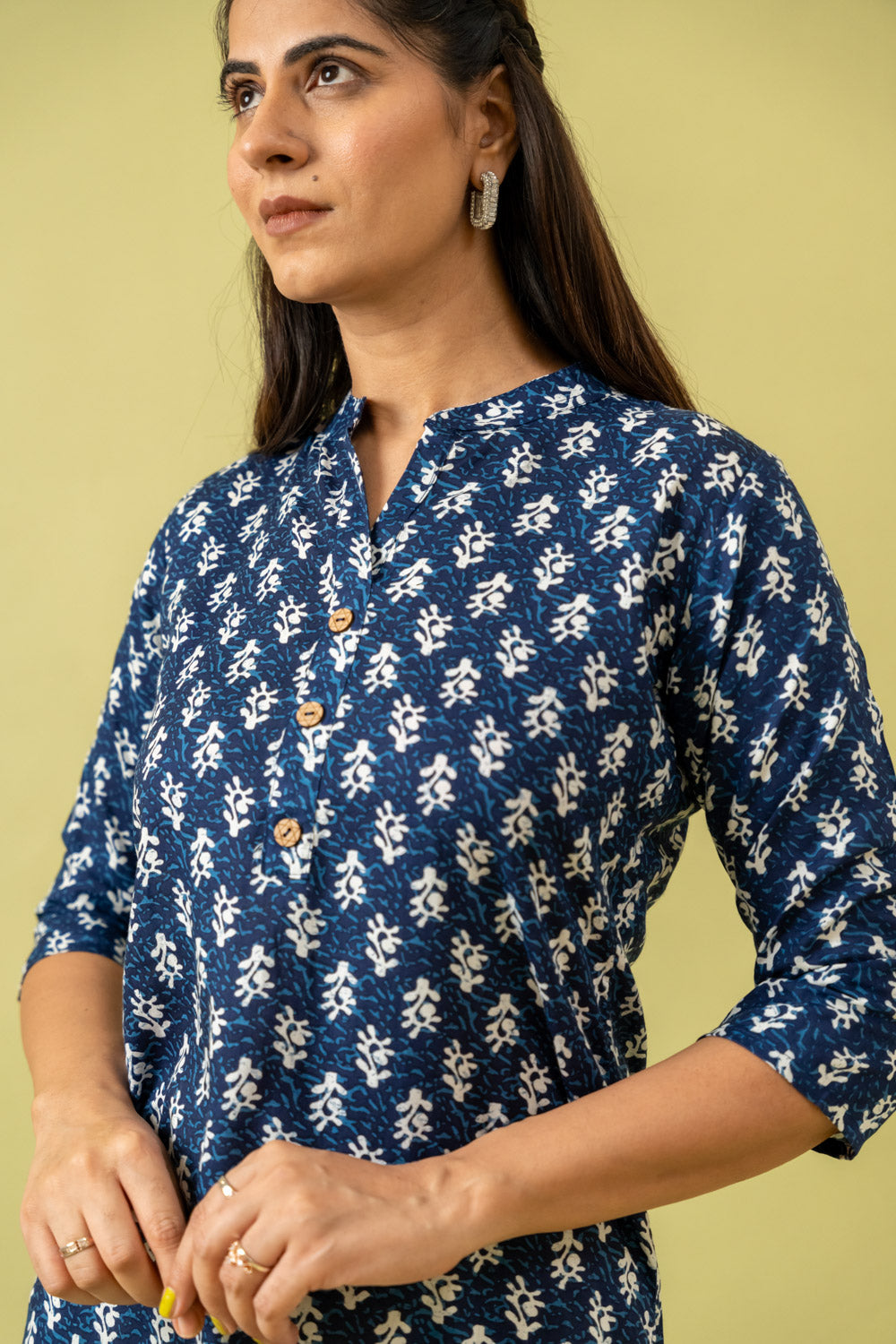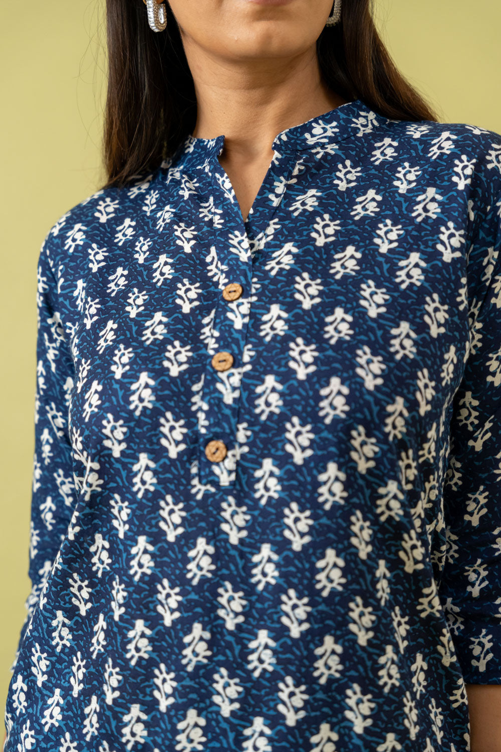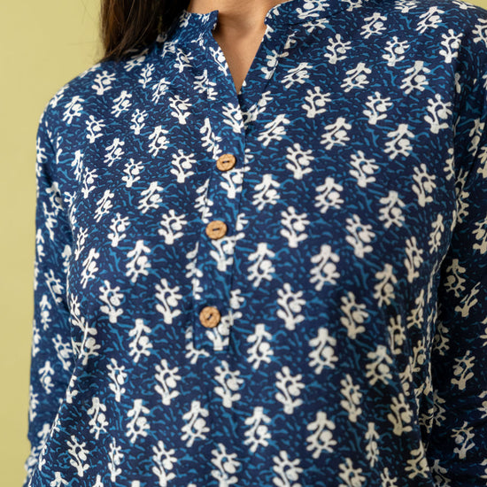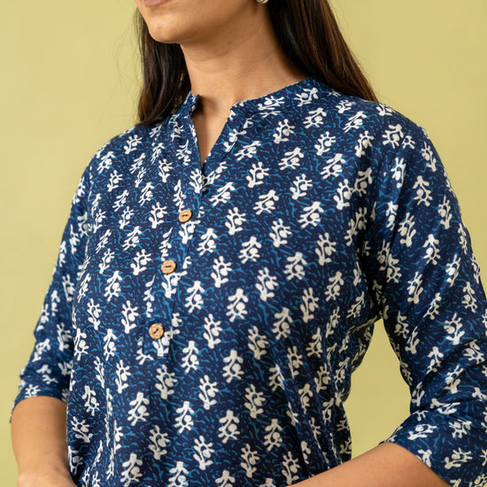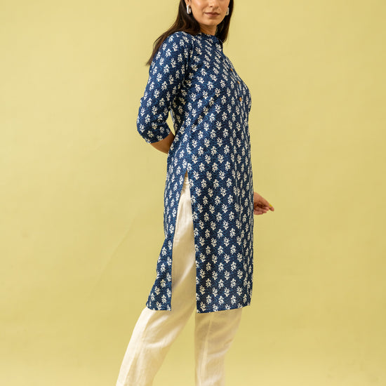 Panna Indigo Blue Floral Printed Cotton Readymade Long Kurta