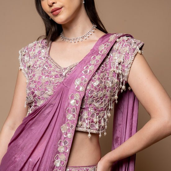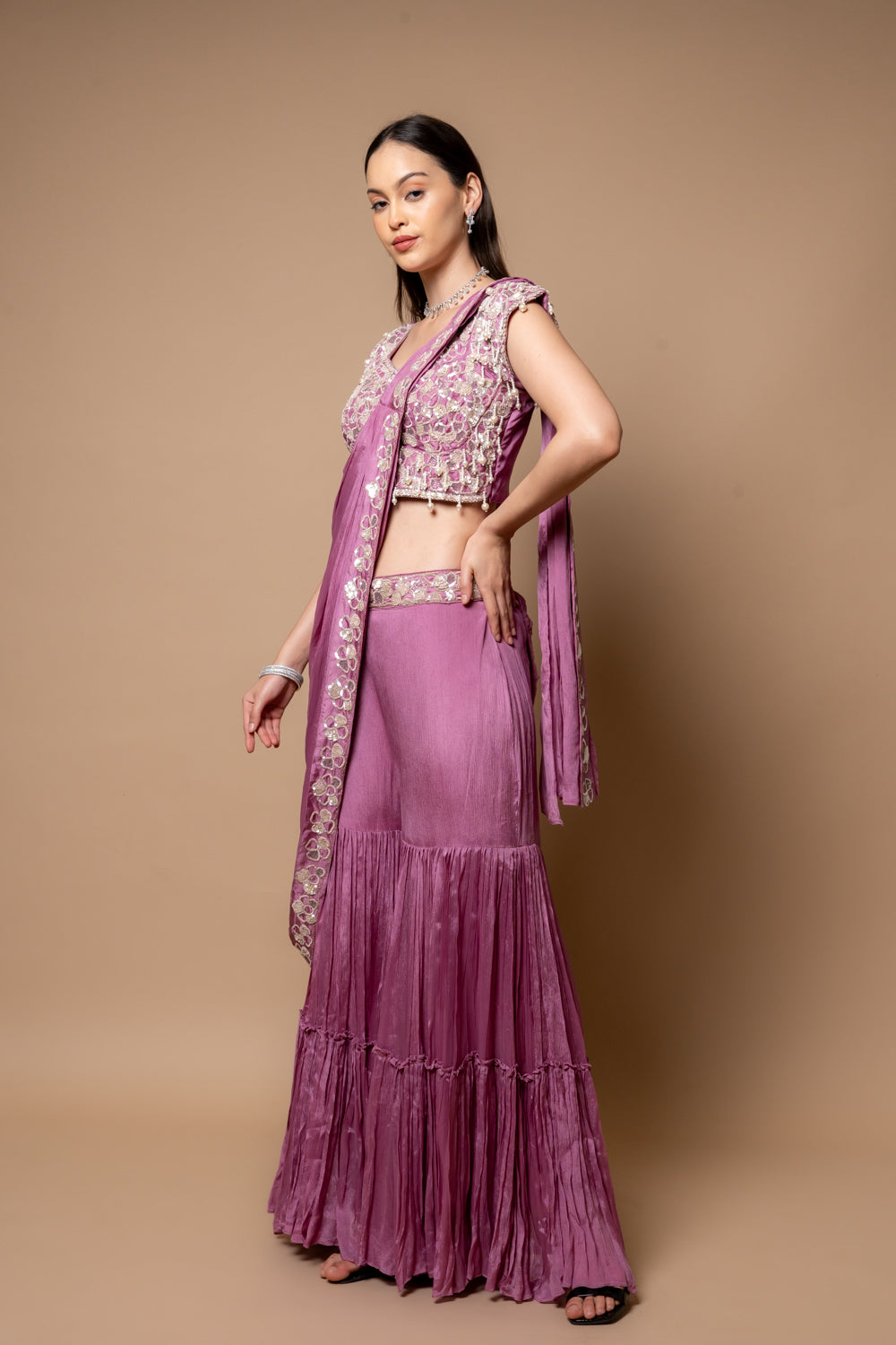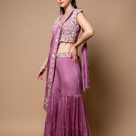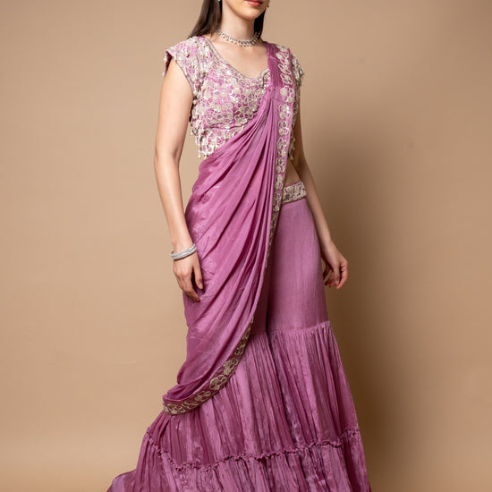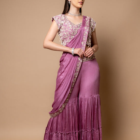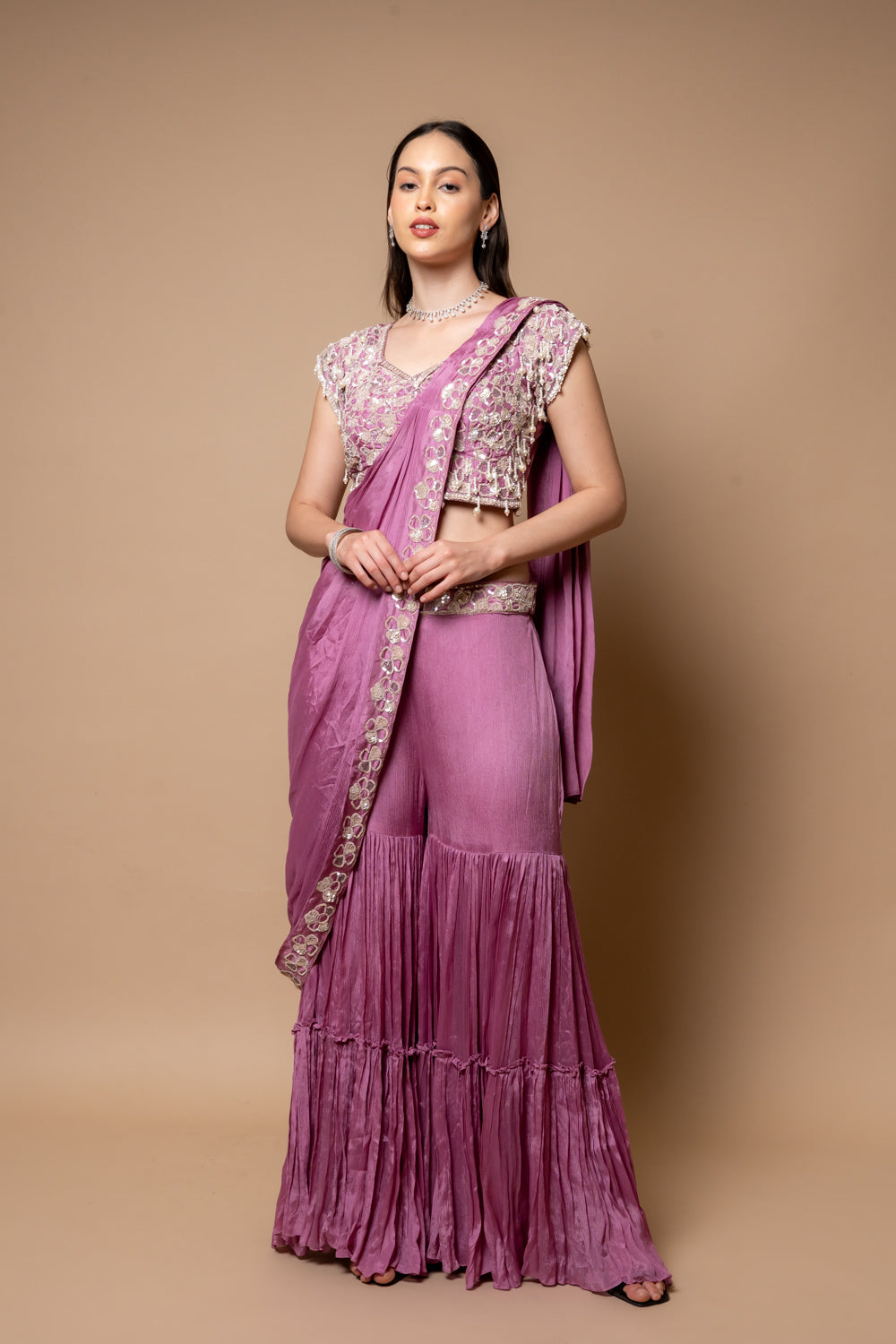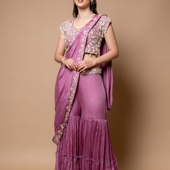 Panna Mauve Cutdana & Sequence Pre-Draped Organza Sharara Saree With Readymade Blouse
