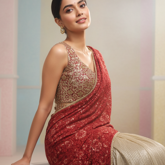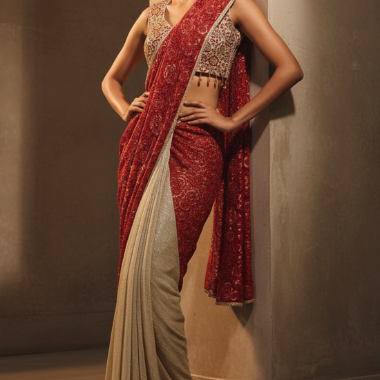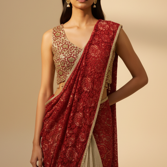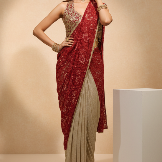Tussar Maroon Lycra Pre-Draped Designer Saree With Readymade Blouse – The Panna Shop