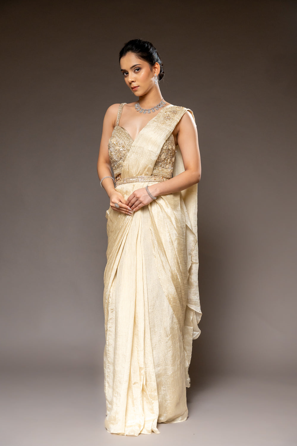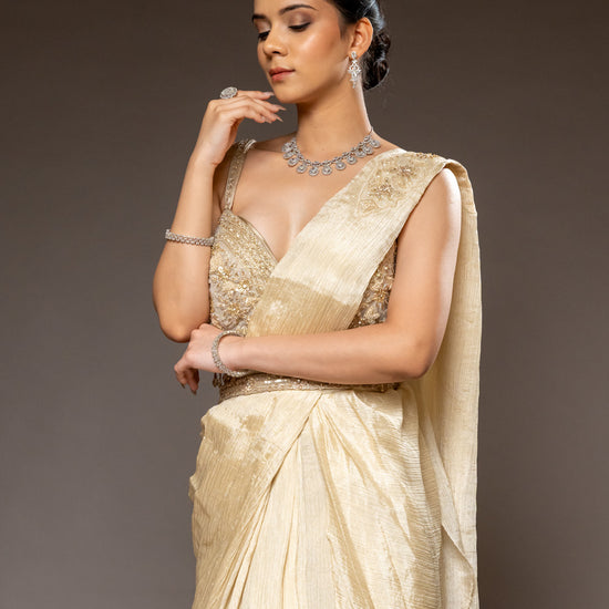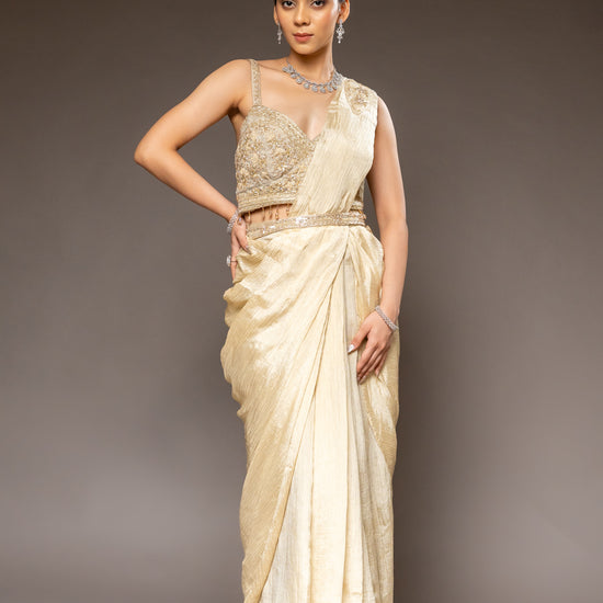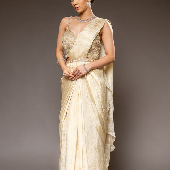 Panna Tussar Crush Pre-Draped Designer Saree With Readymade Blouse