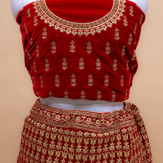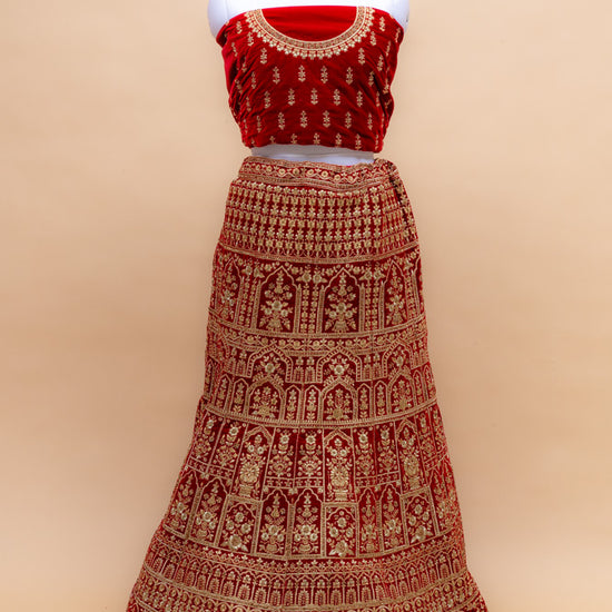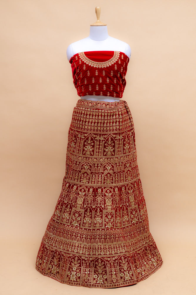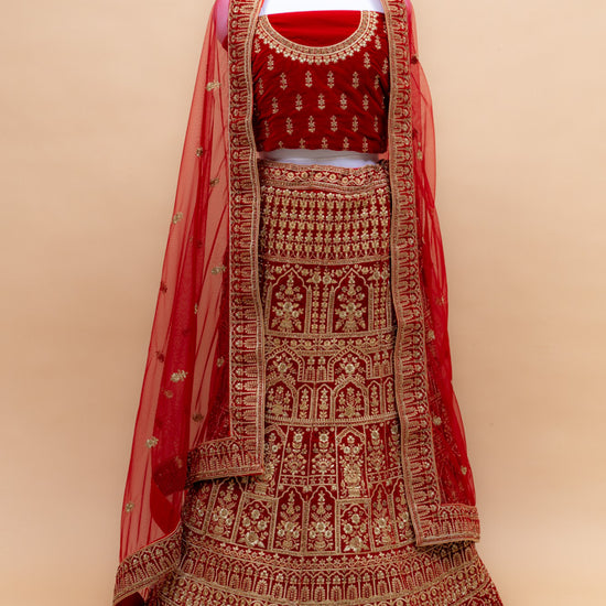Panna Maroon Velvet Lehenga Set With Net Dupatta