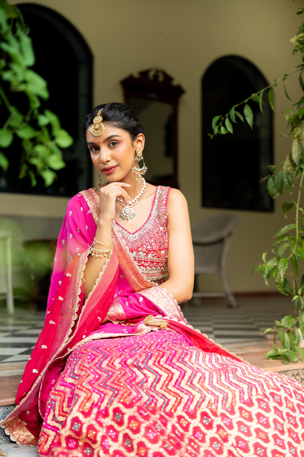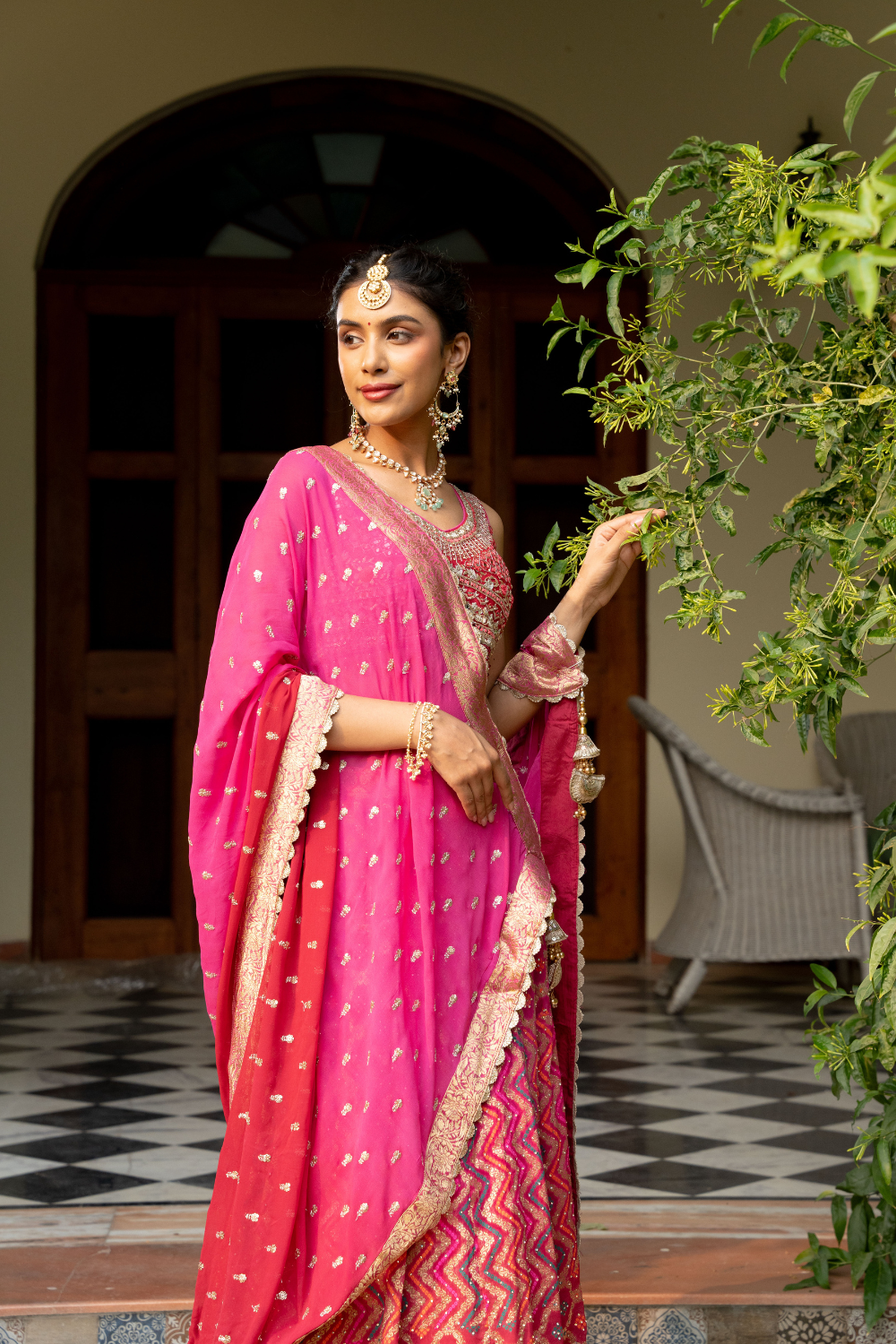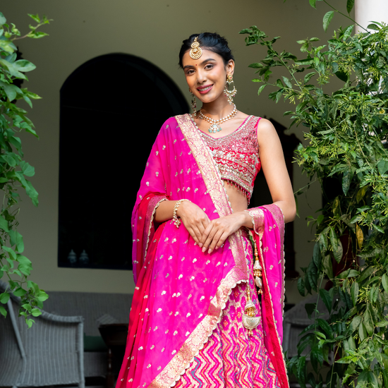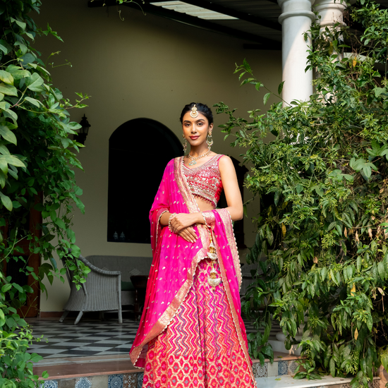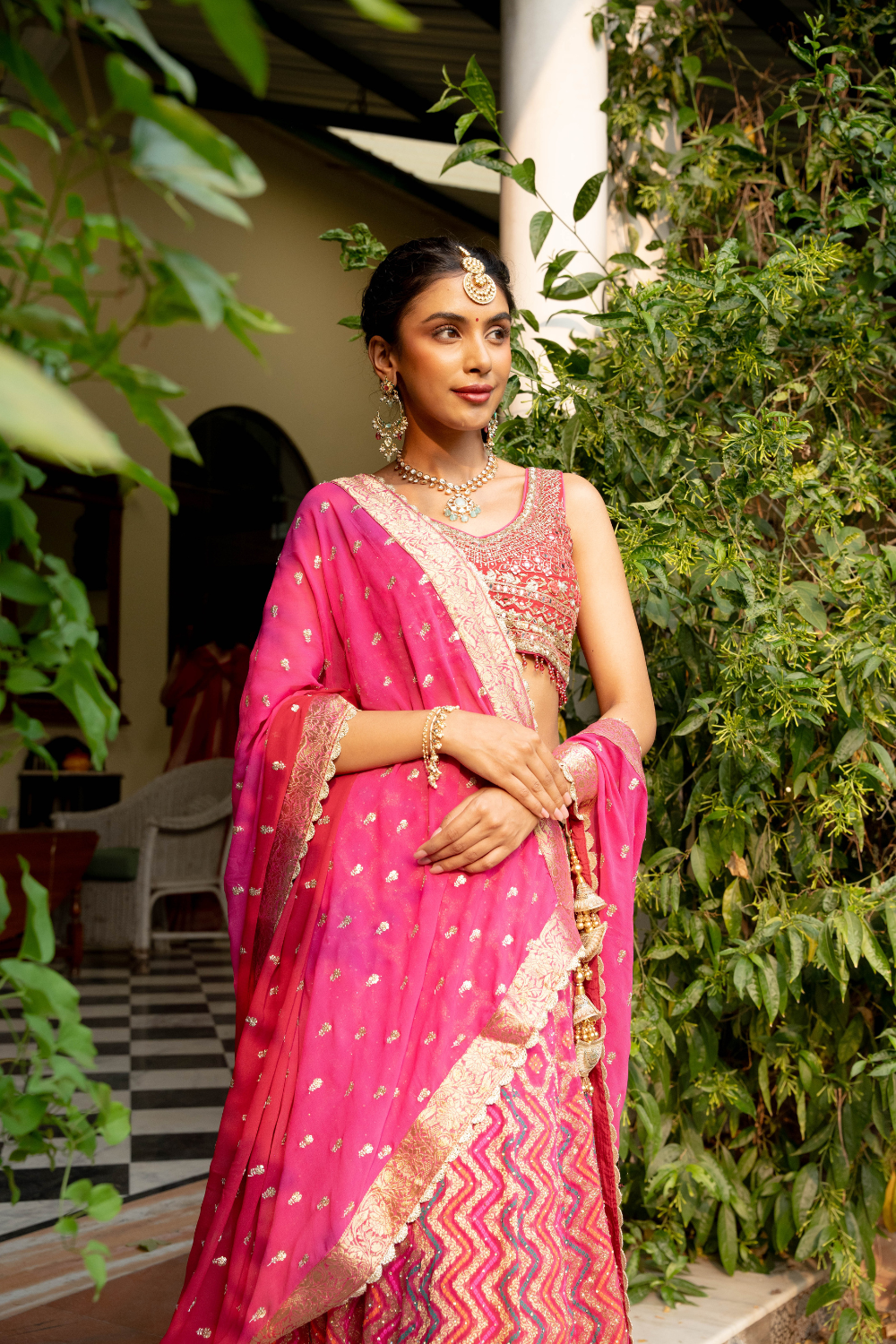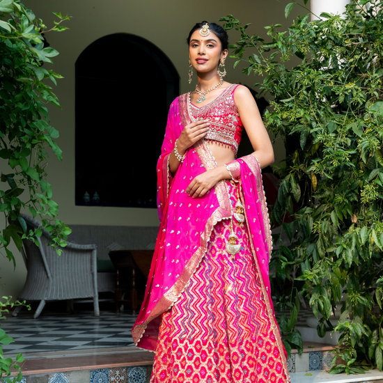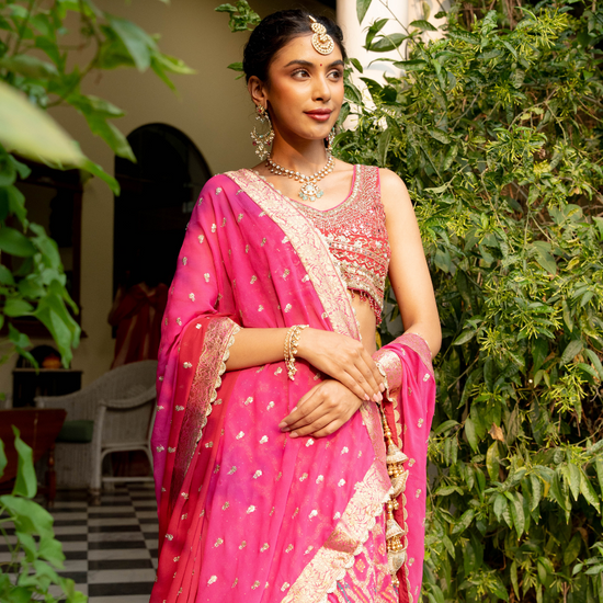 Featuring Banarasi Woven Zari, Sequence Mirror, Threadwork, Embroidery, this Georgette lehenga is designed for [Occasion]. Its Heavy finish ensures ease and grace. Keep it pristine with Dry Wash / Dry Clean.