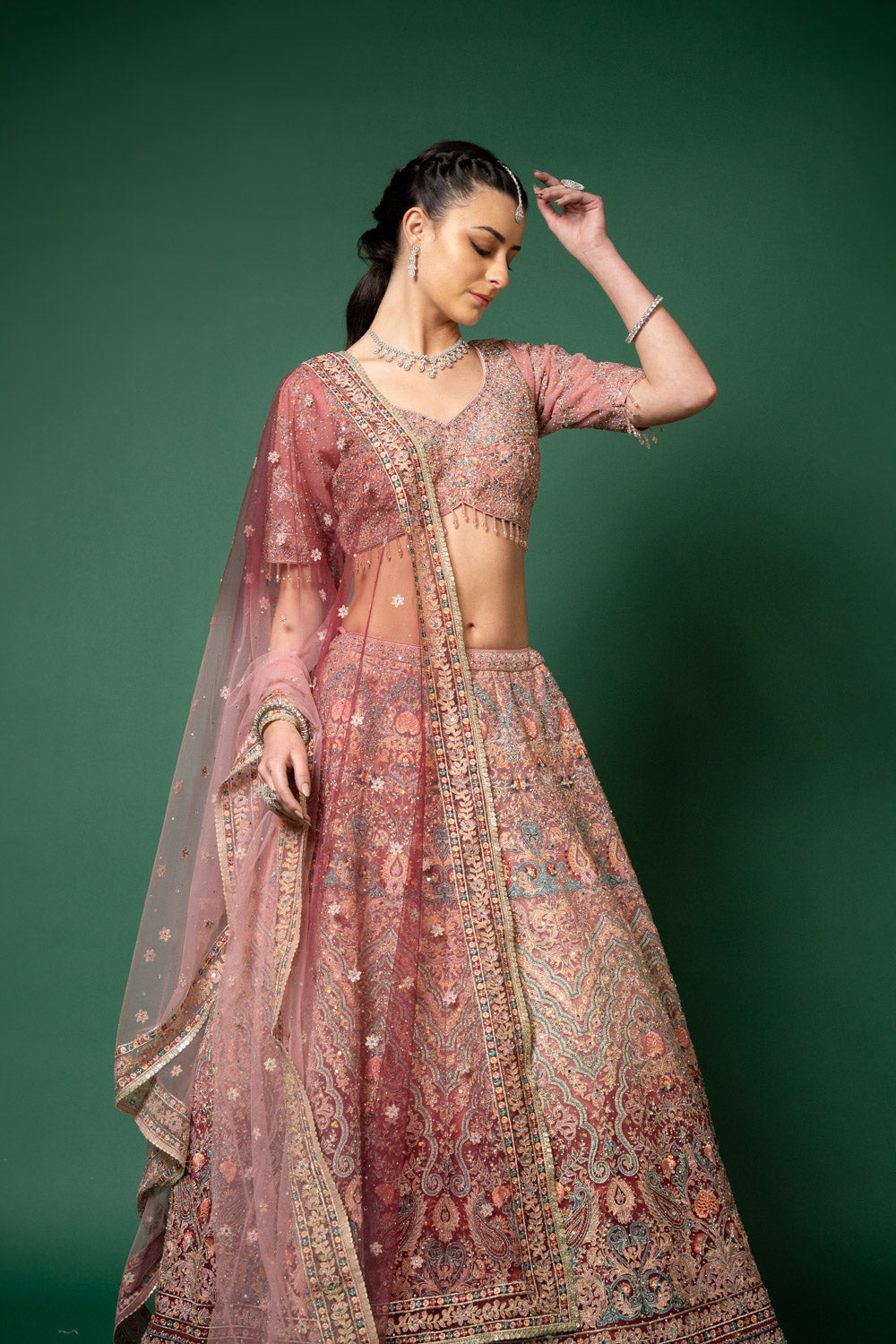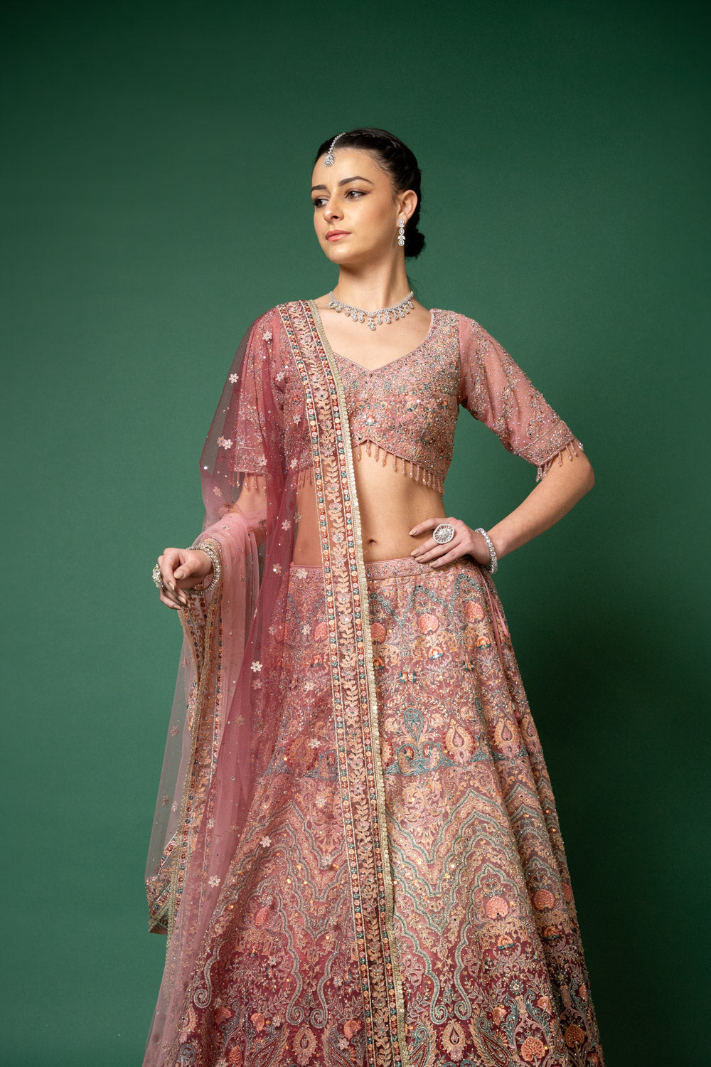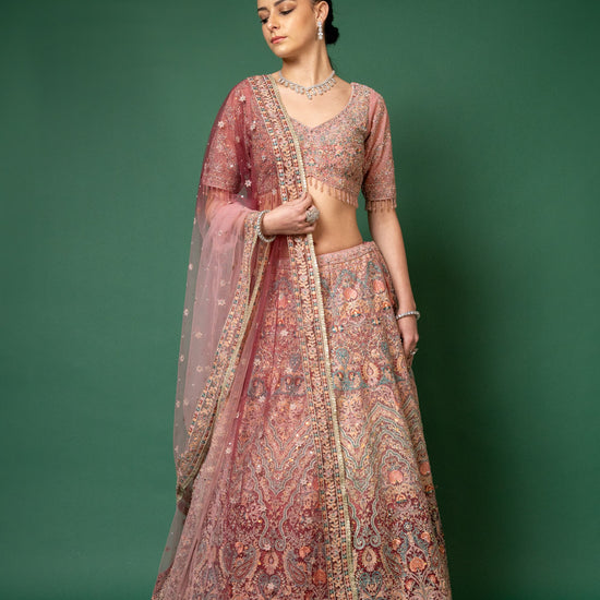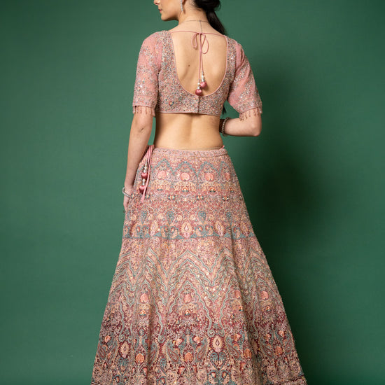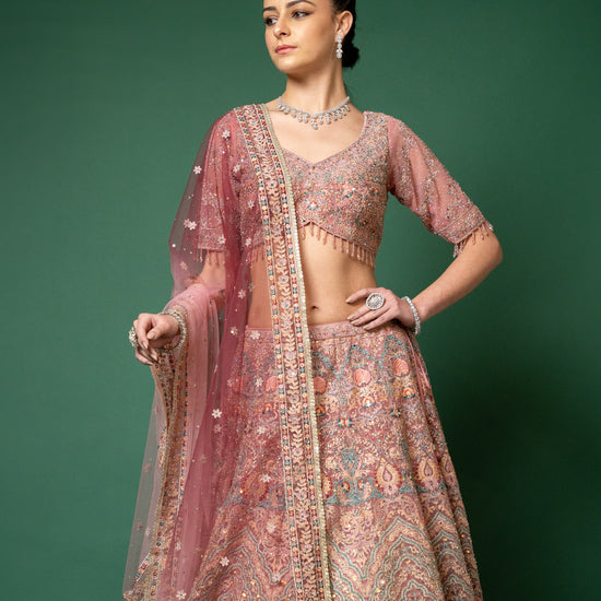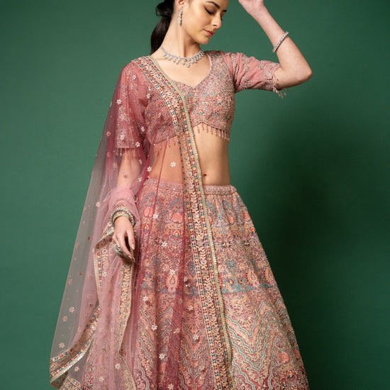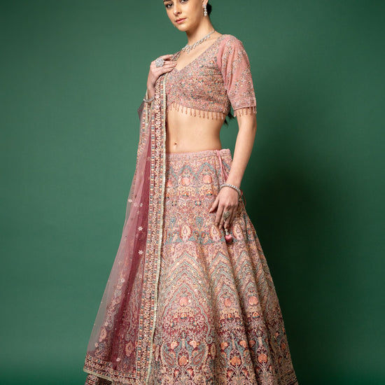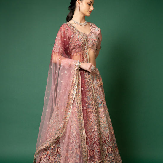 Panna Gajari Threadwork, Embroidery, Zari, Zarkan, Mirror & Bead, Sequence Net Lehenga Set With Readymade Blouse