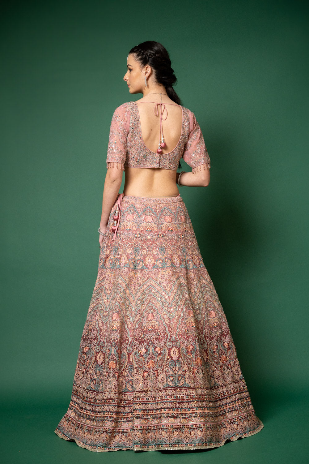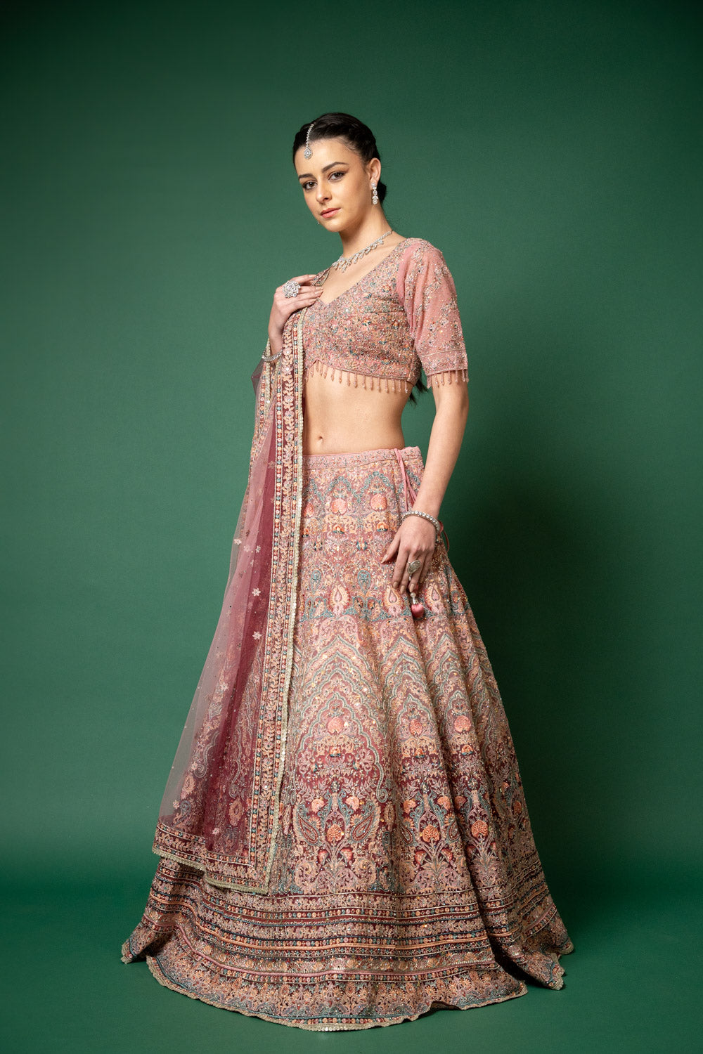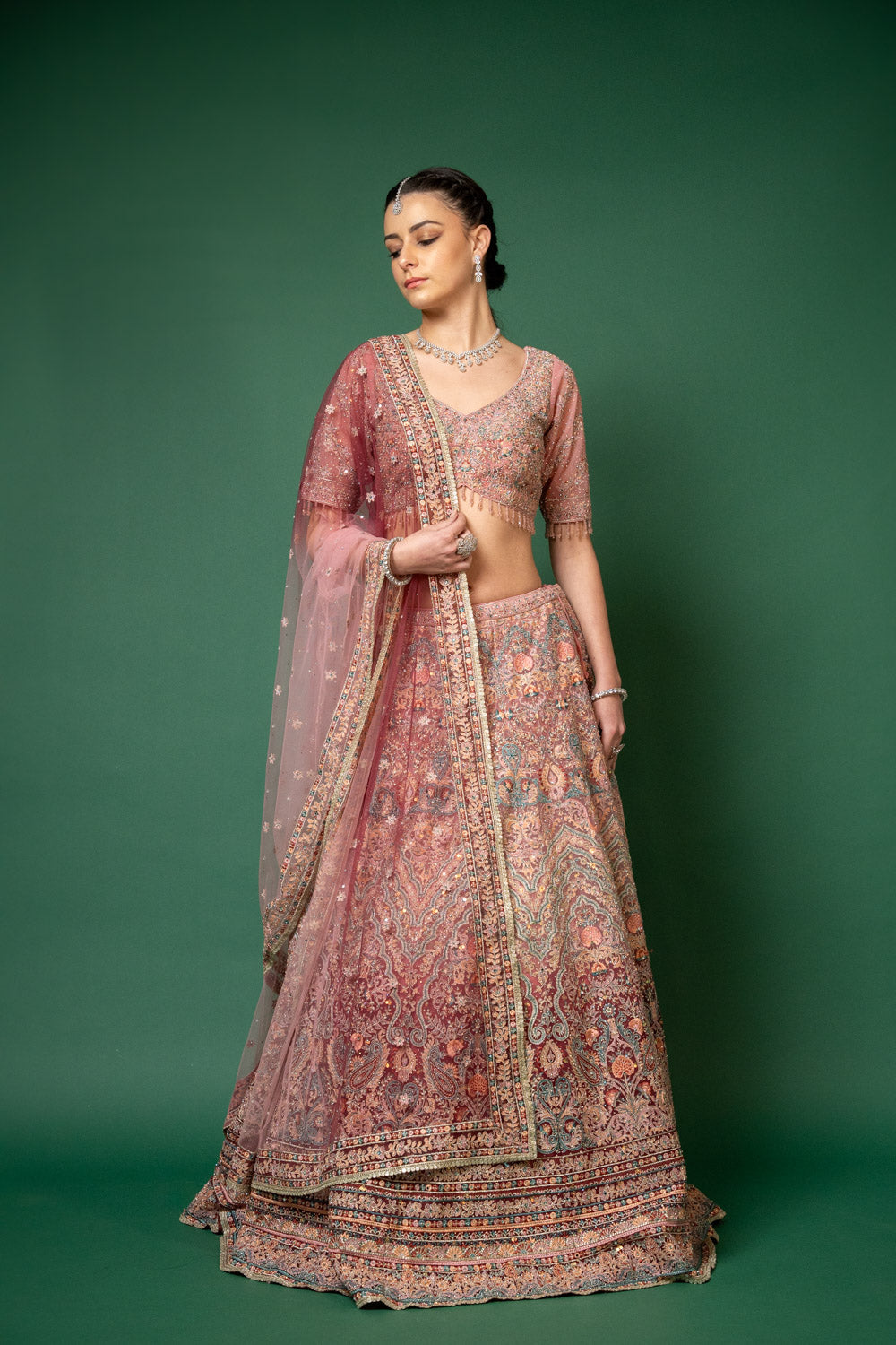 Panna Gajari Threadwork, Embroidery, Zari, Zarkan, Mirror & Bead, Sequence Net Lehenga Set With Readymade Blouse