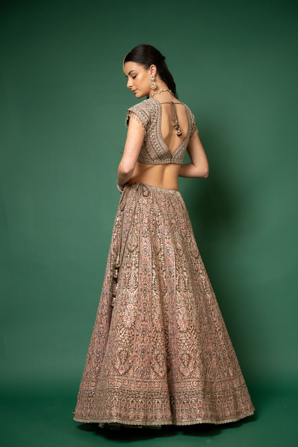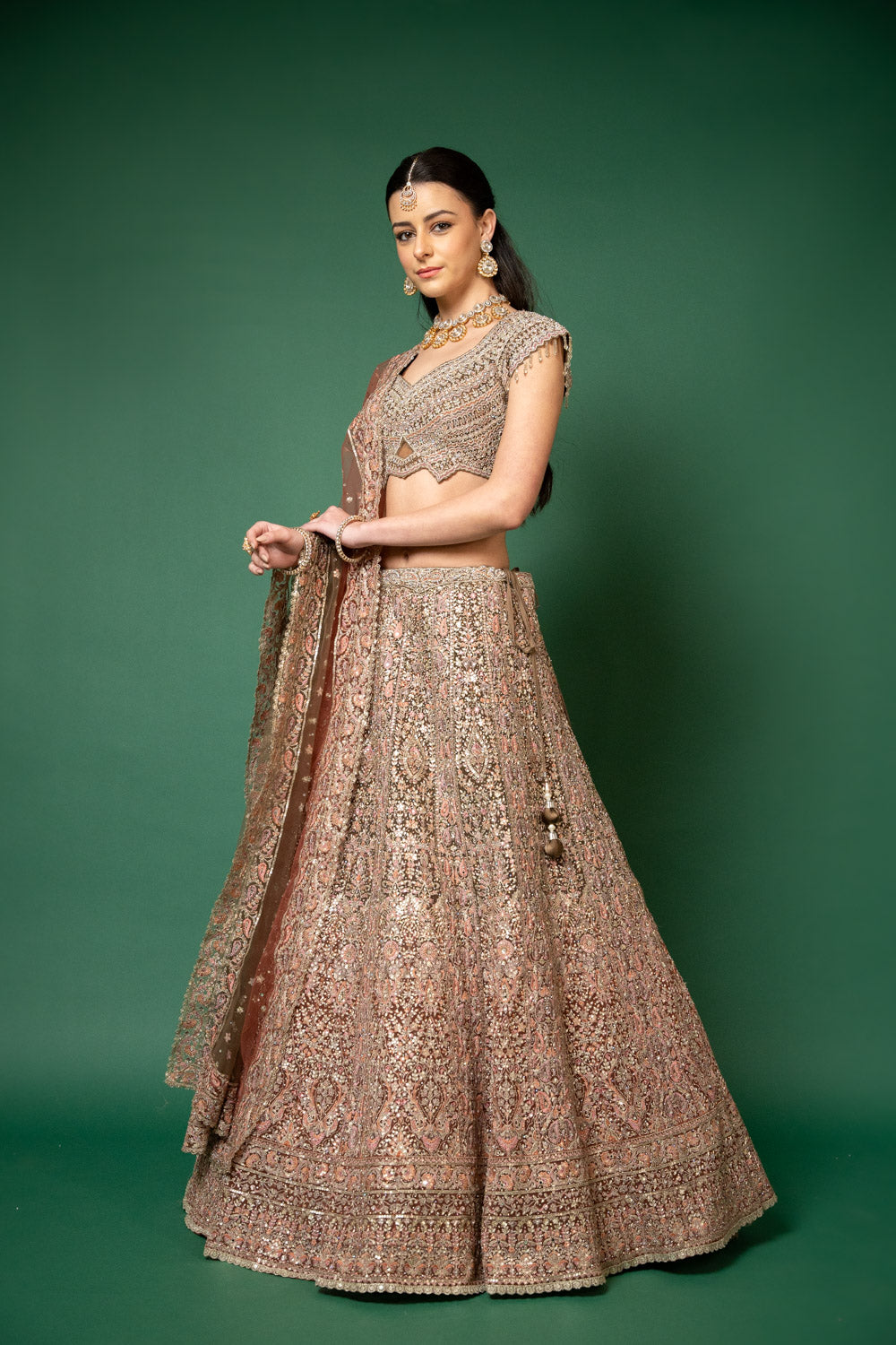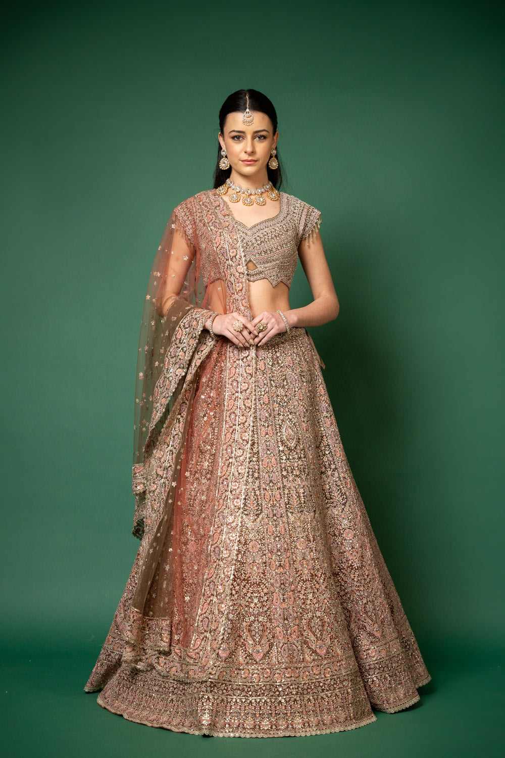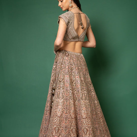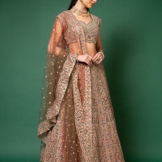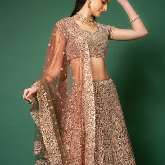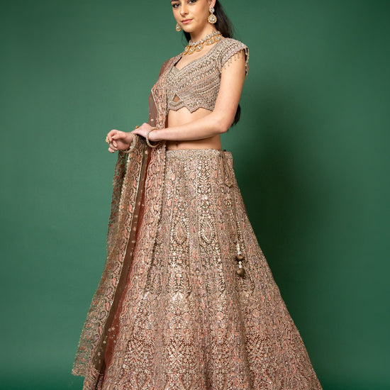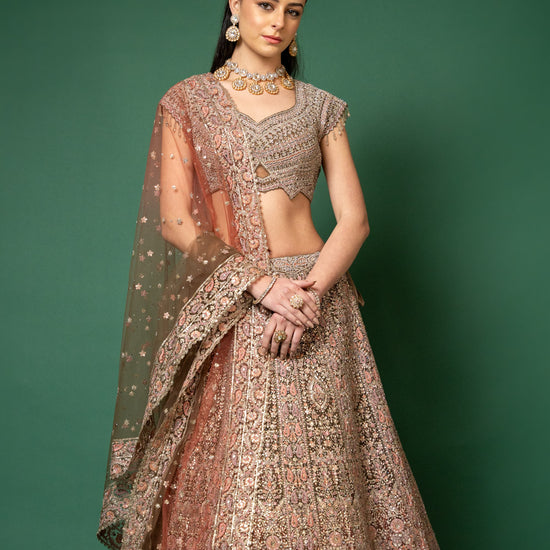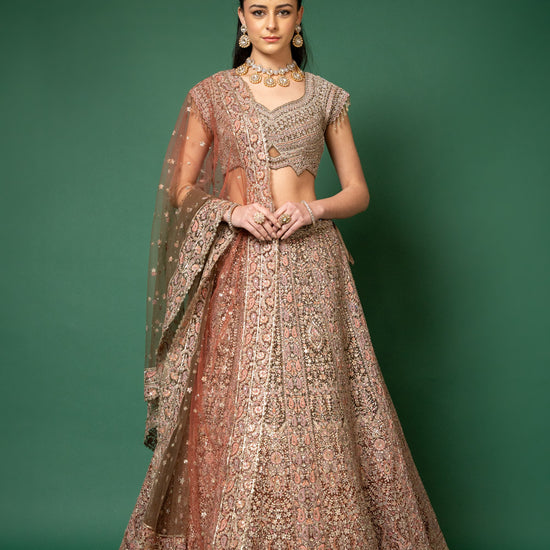 Panna Peach Threadwork, Embroidery, Zari, Zarkan, Mirror & Bead, Sequence Net Lehenga Set With Readymade Blouse