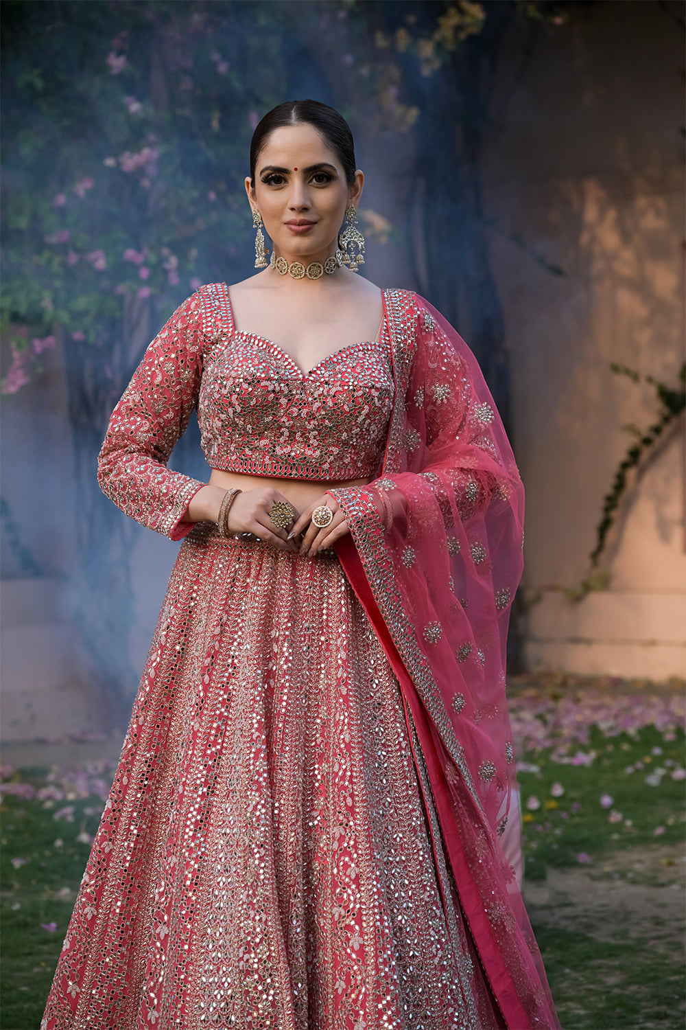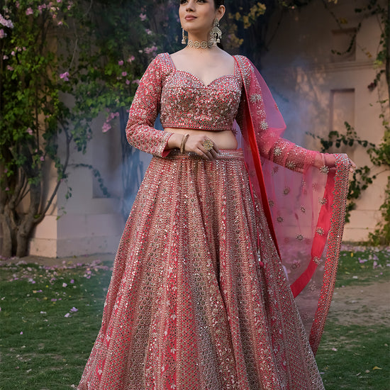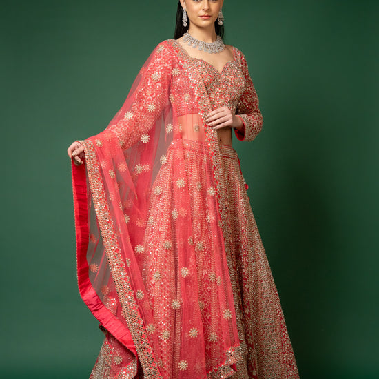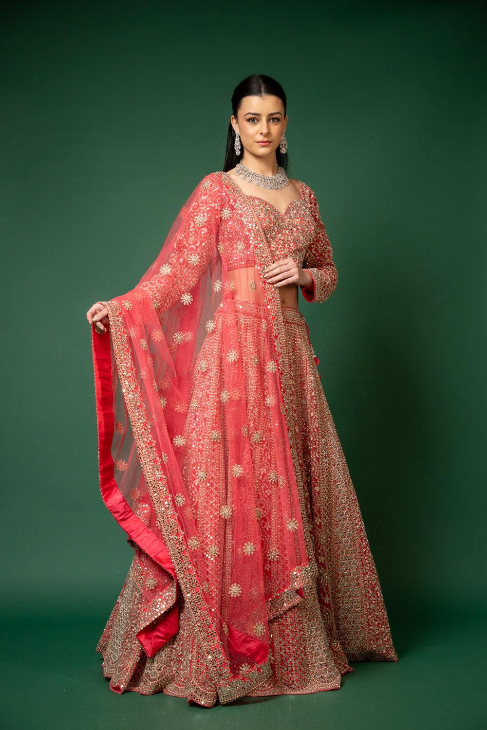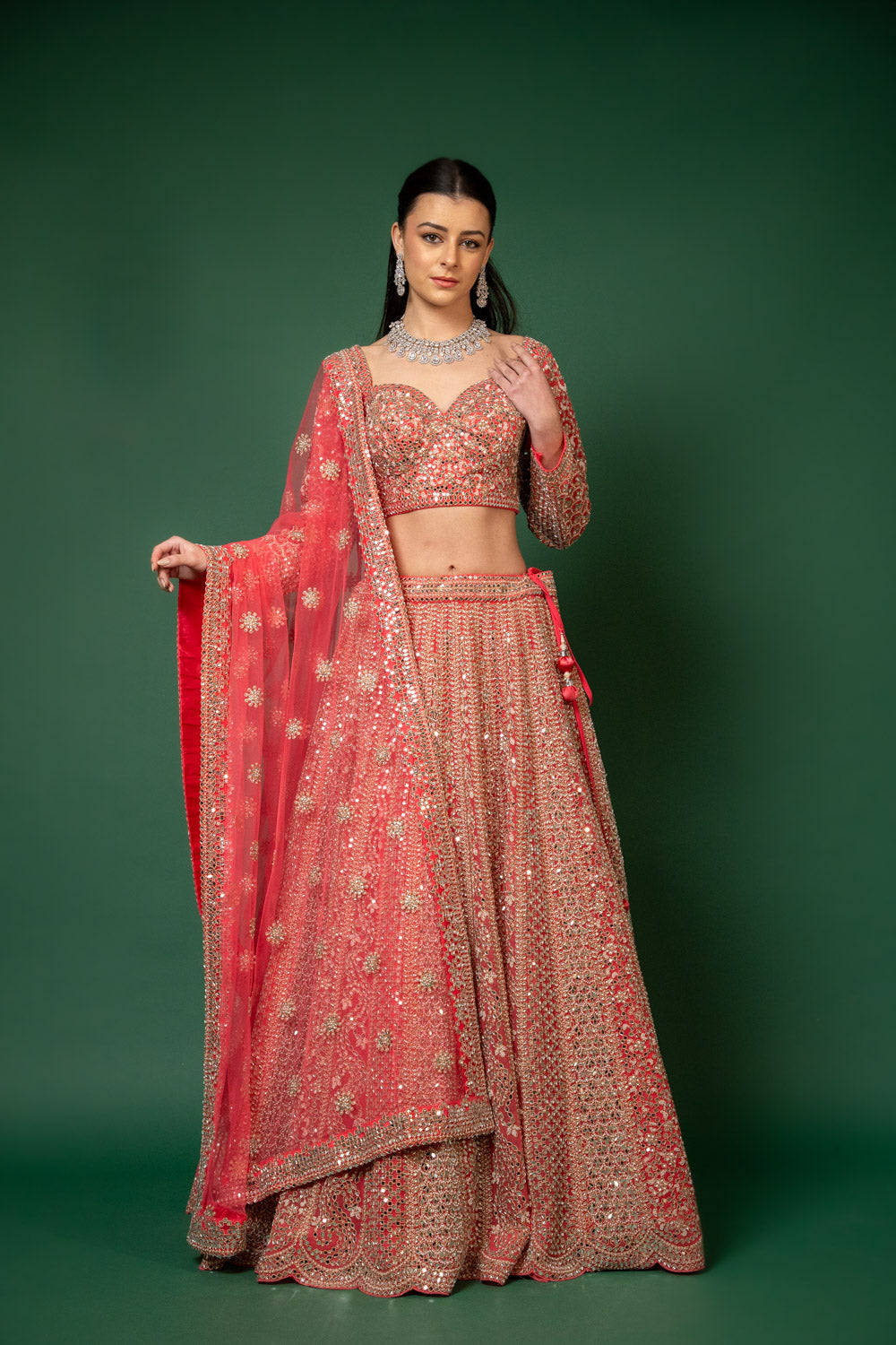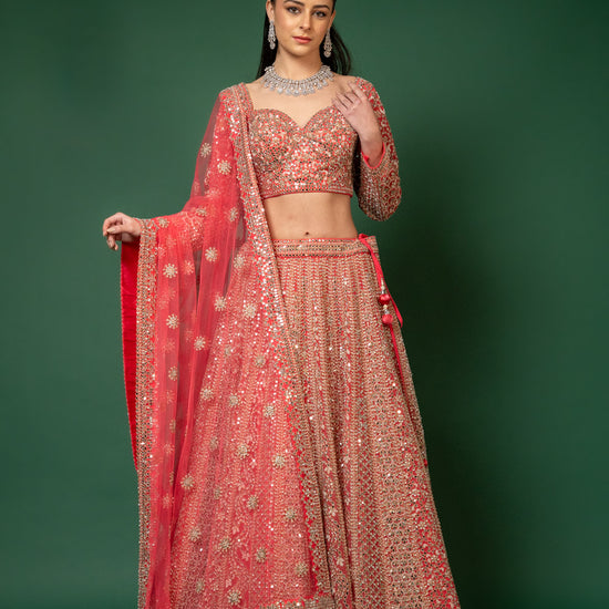 Panna Coral Net Lehenga Set And Net Dupatta With Readymade Blouse