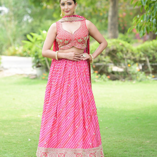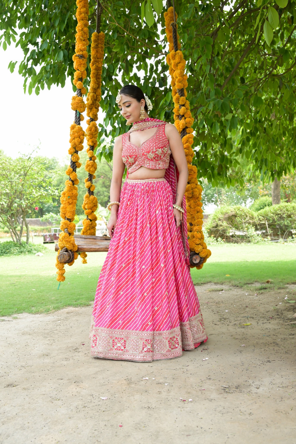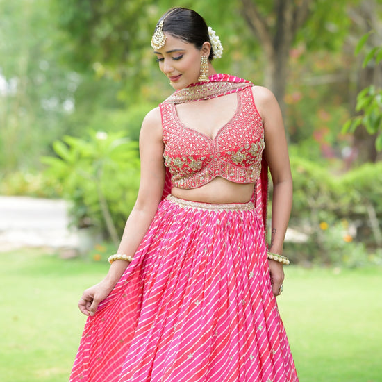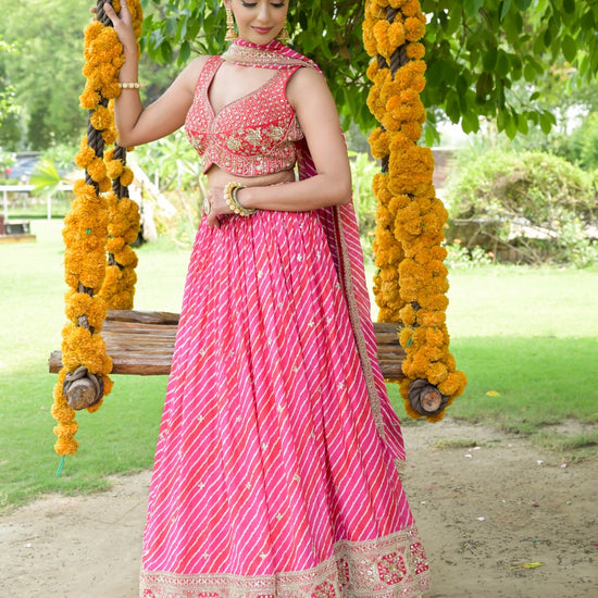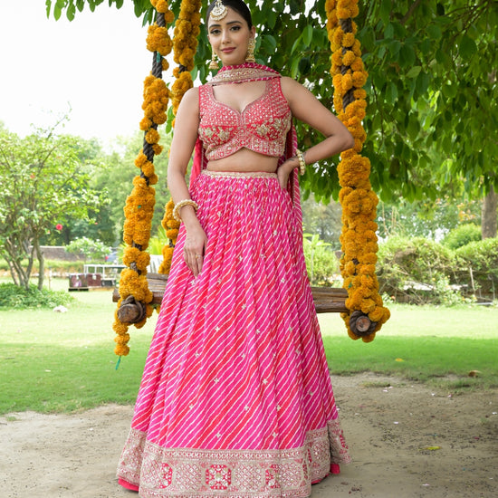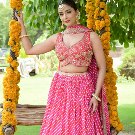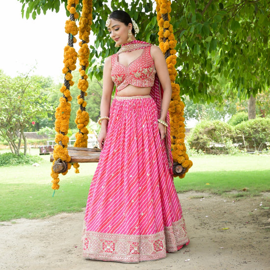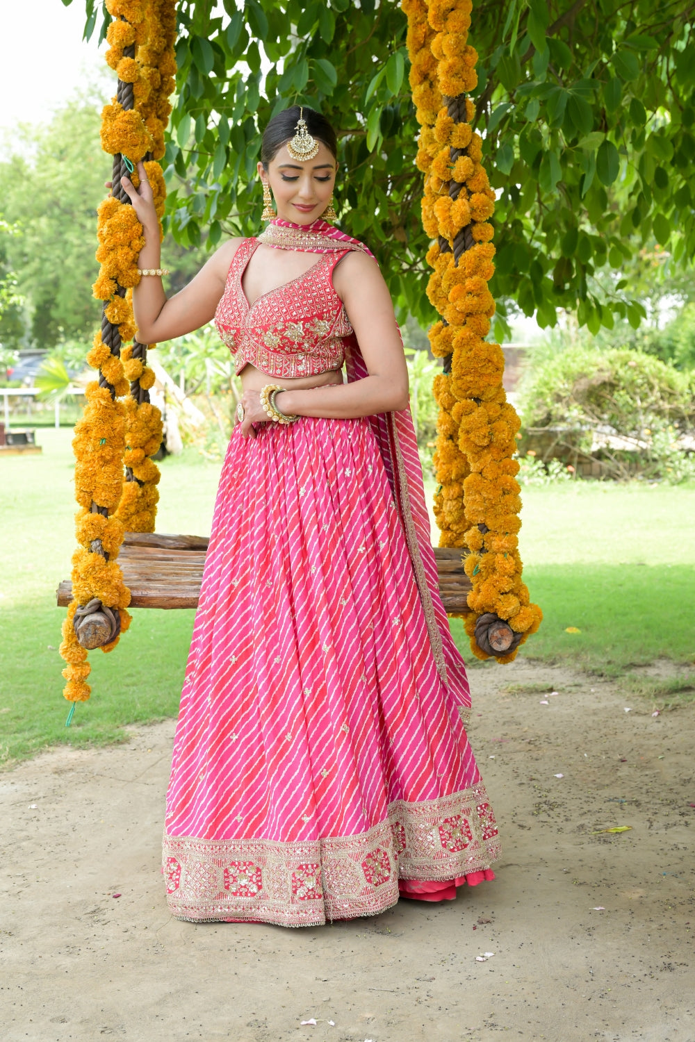 Crafted from Chinon, this lehenga with Bead, Cutdana, Dabka, Mirror, Lehriya Print, Sequence, Threadwork, Zari & Zarkan is ideal for Party Wear. Its Heavy feel ensures both comfort and style. Dry Wash / Dry Clean recommended.