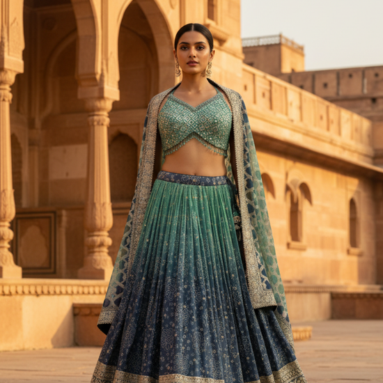 Panna Rama Navy Tissue Lehenga Set And Tissue Dupatta With Readymade Blouse