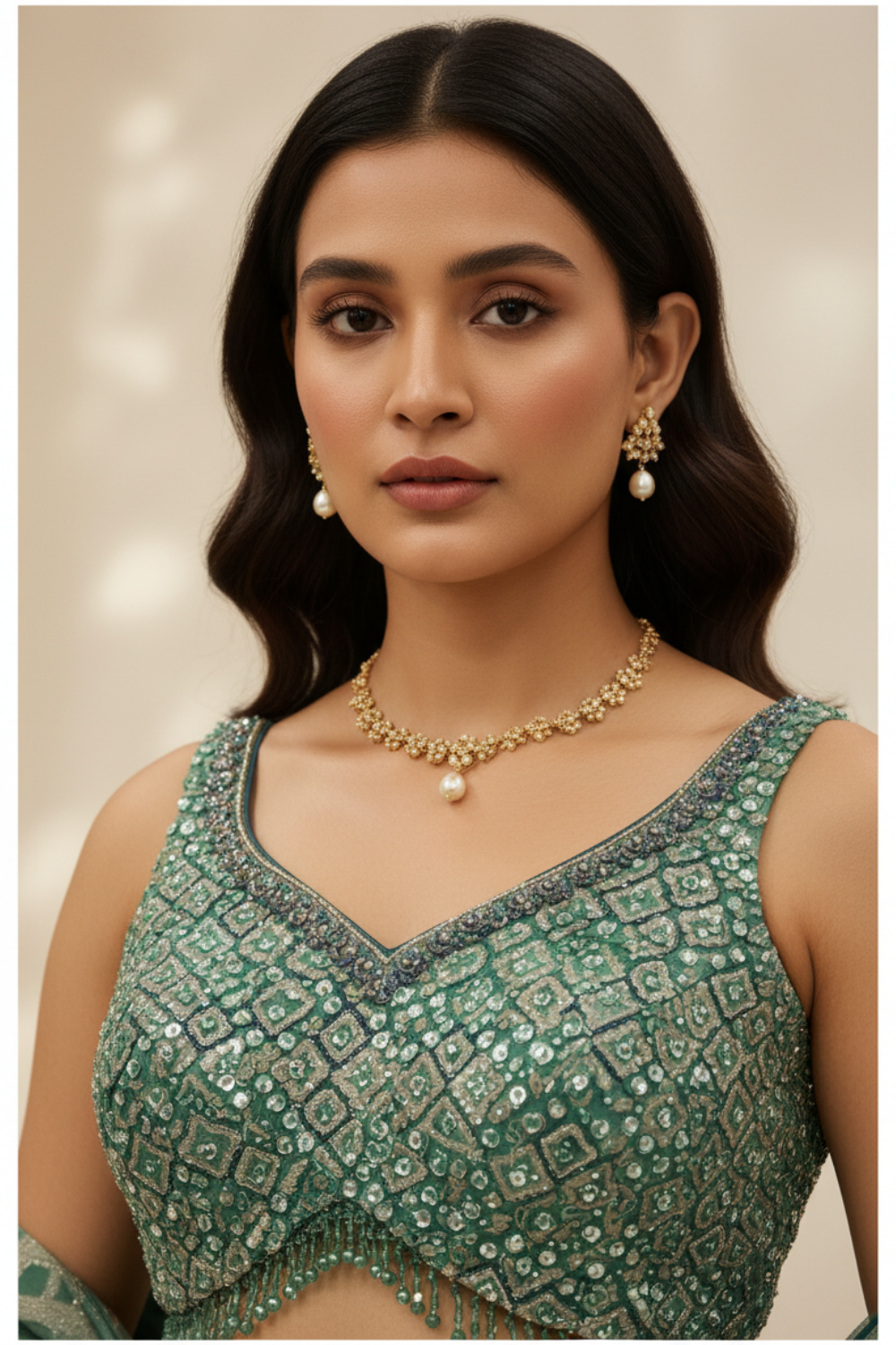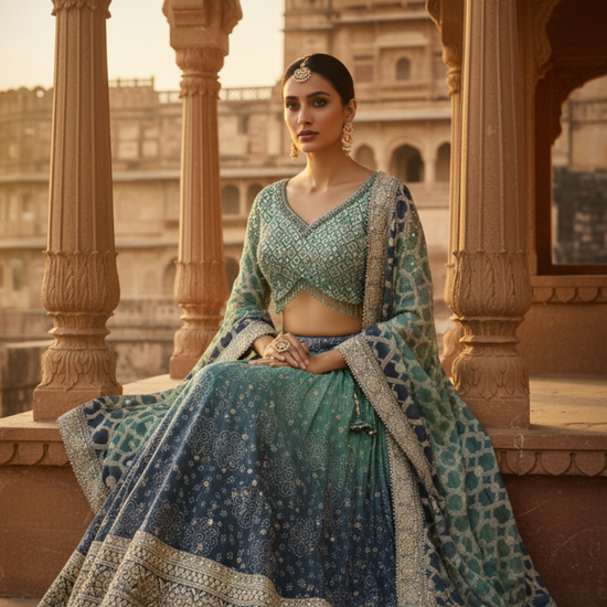 Crafted from Tissue, this lehenga with Bandhini print, Zari work, Mirror work, Bead work is ideal for Party Wear. Its Lightweight feel ensures both comfort and style. Dry Wash / Dry Clean recommended.