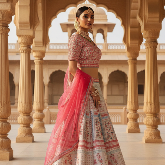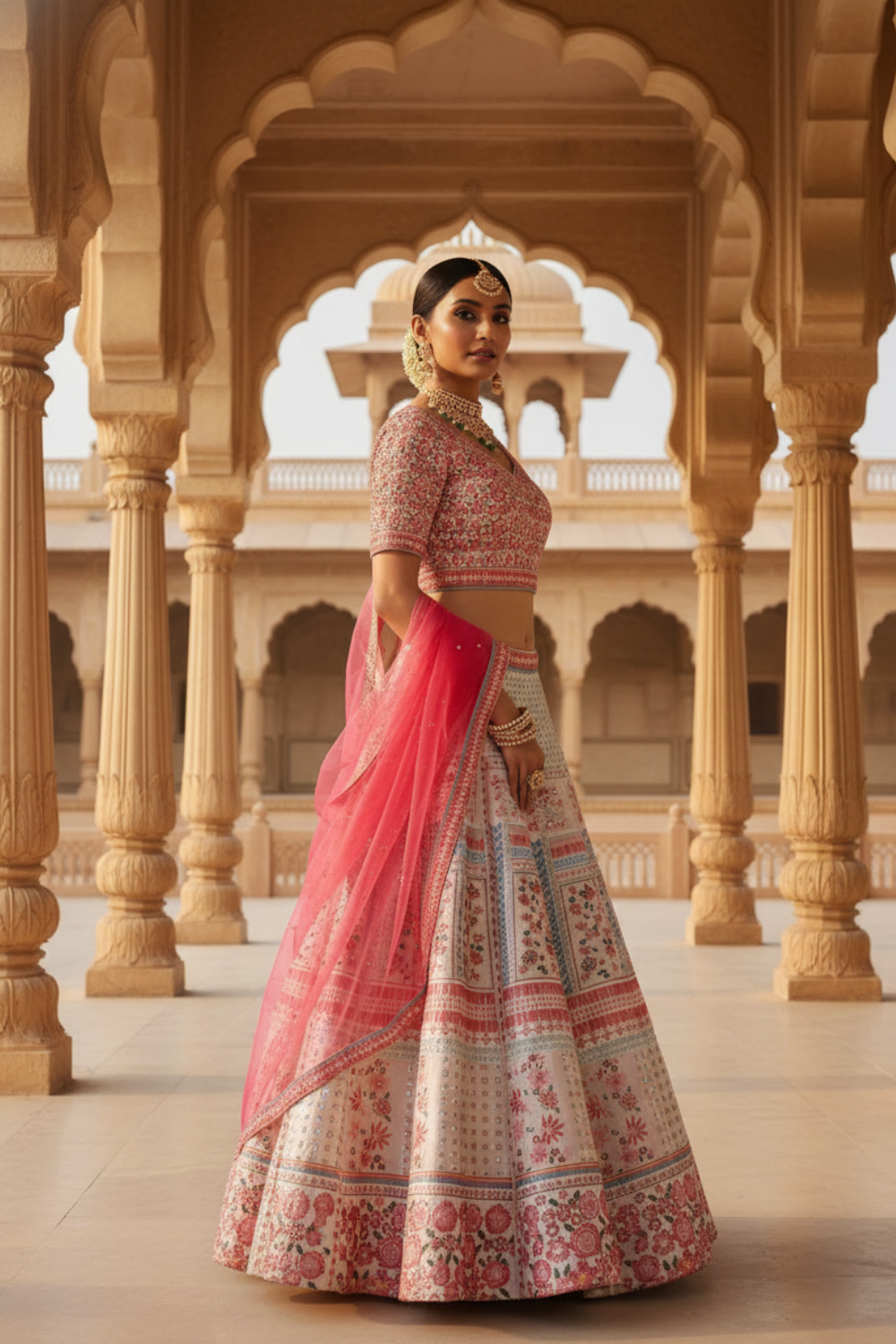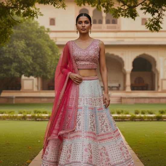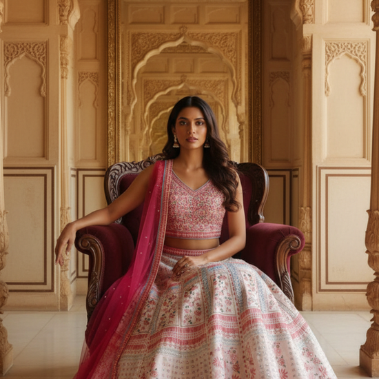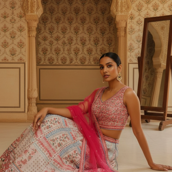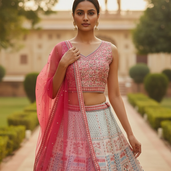 Crafted from Raw Silk, this lehenga with Mirror work & Stone work is ideal for Party Wear. Its Heavy feel ensures both comfort and style. Dry Wash / Dry Clean recommended.
