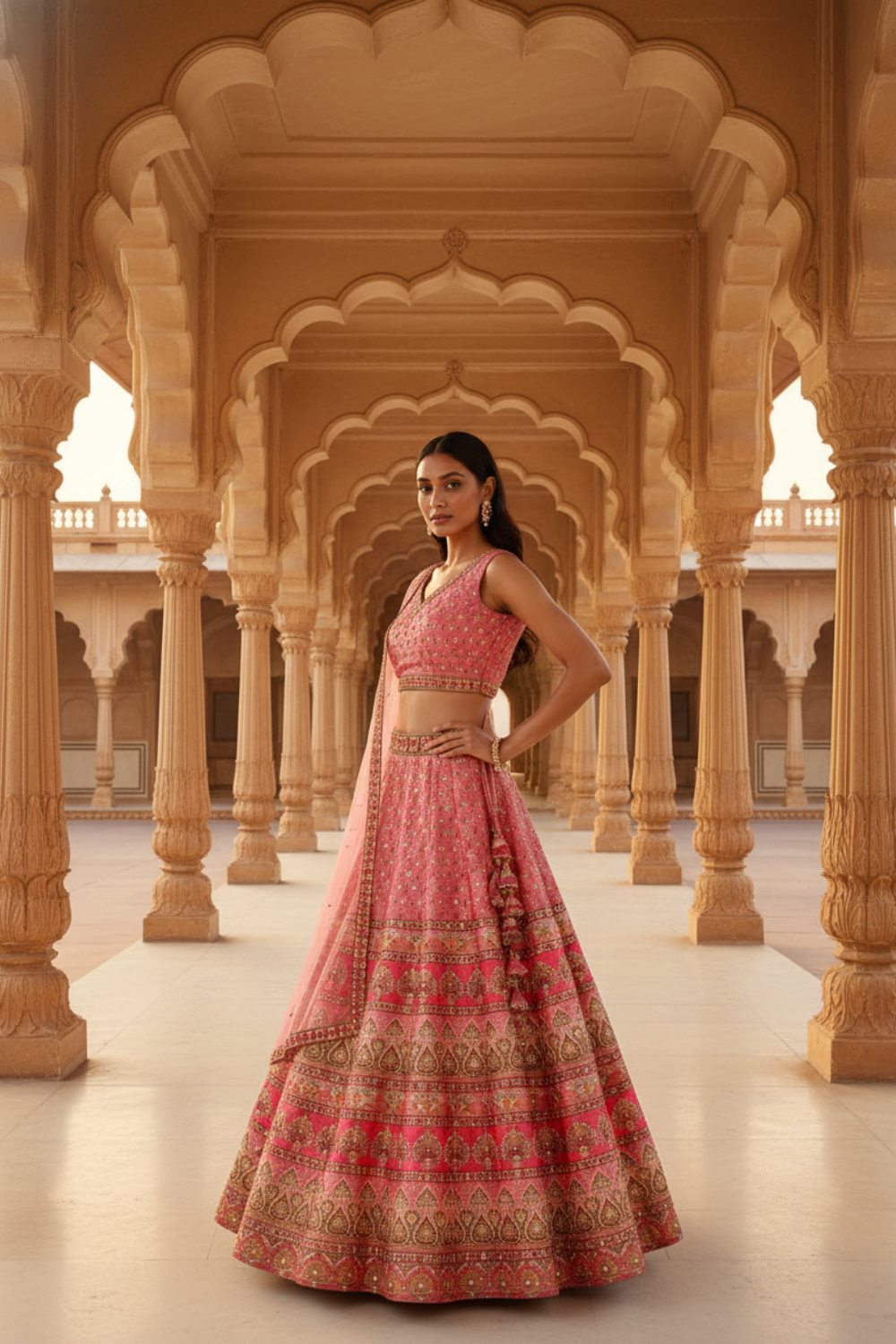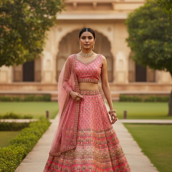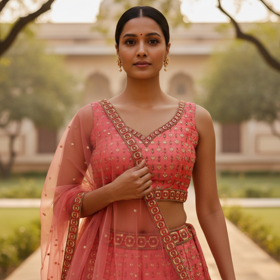 Panna Peach Cotton Silk Lehenga Set And Net Dupatta With Readymade Blouse