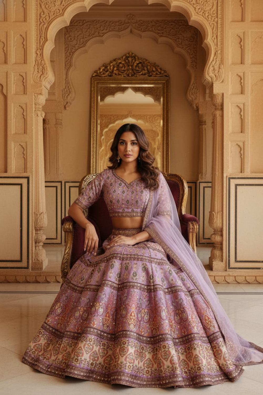 Crafted from Cotton Silk, this lehenga with Mirror work & Stone work is ideal for Party Wear. Its Heavy feel ensures both comfort and style. Dry Wash / Dry Clean recommended.
