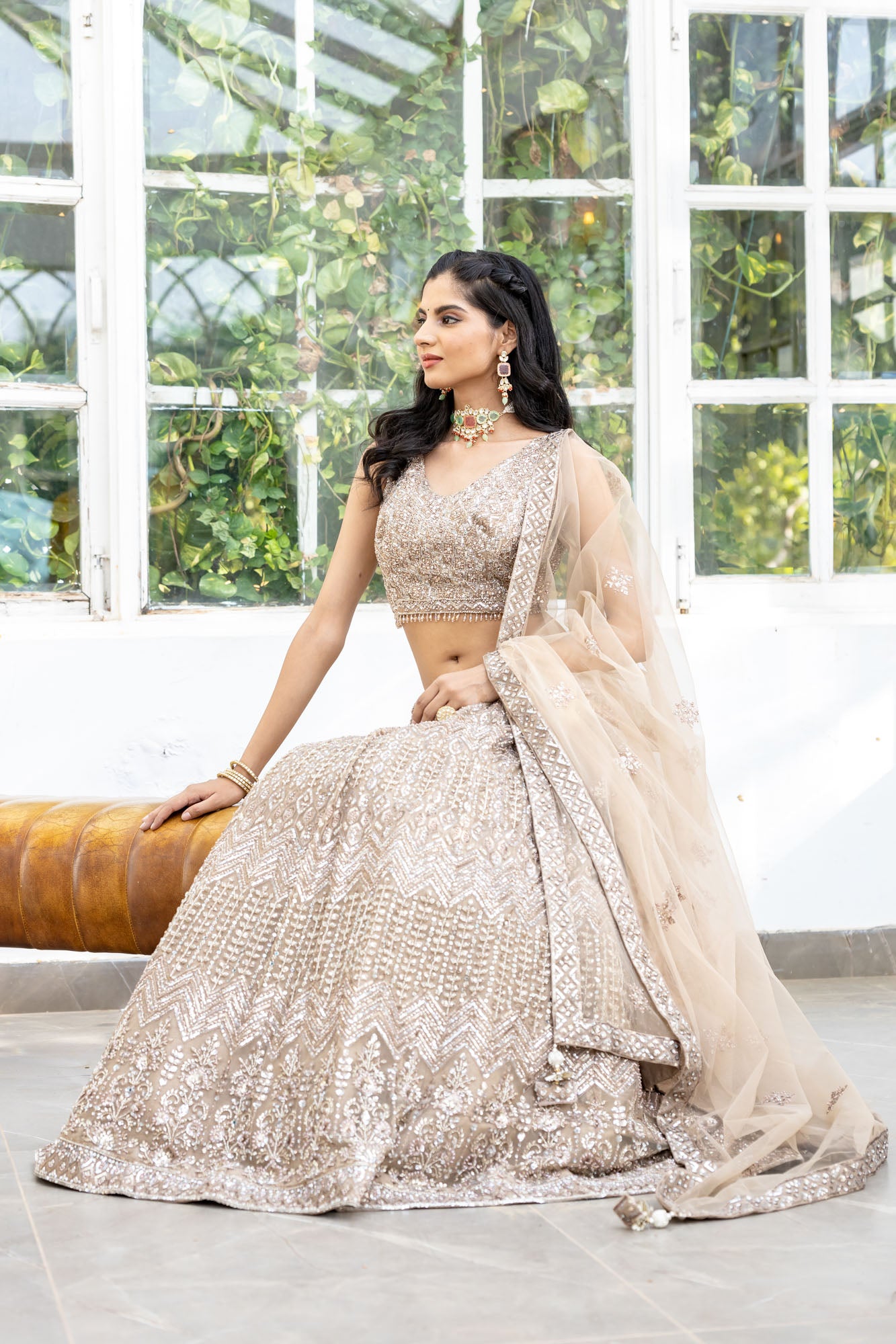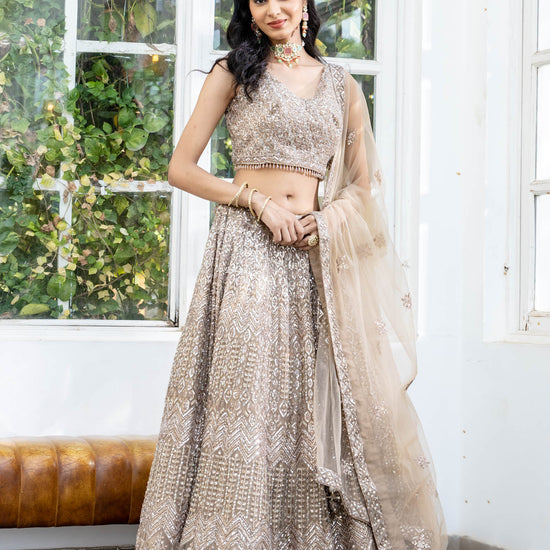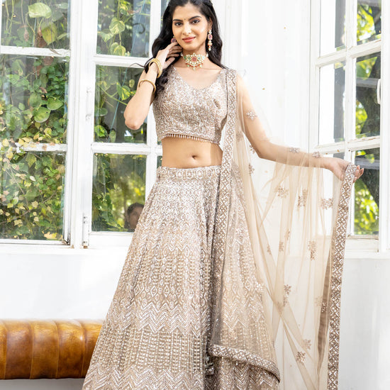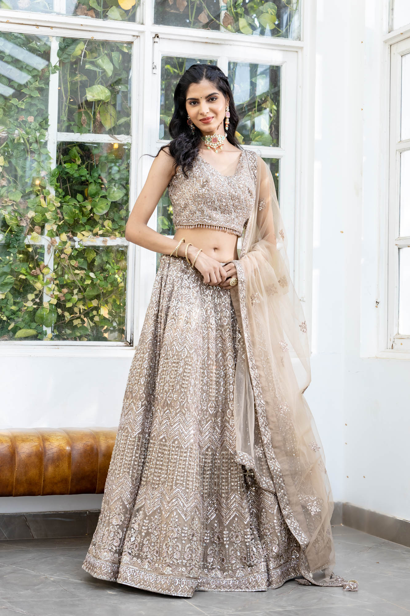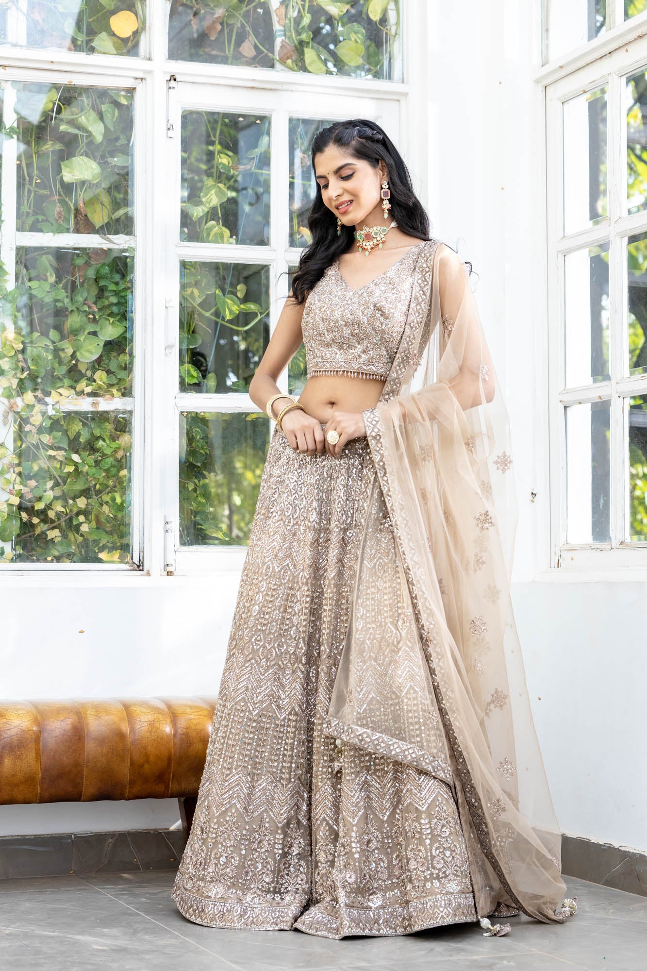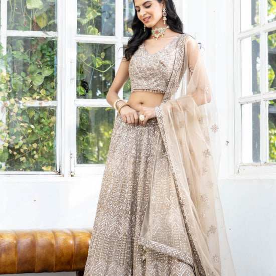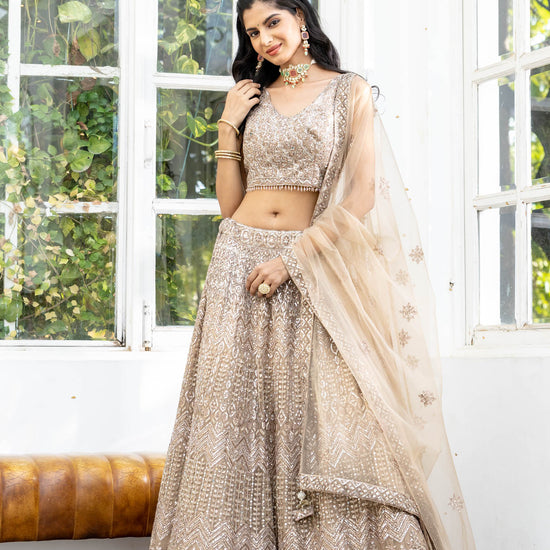 Panna Chikoo Net Lehenga Set With Readymade Blouse
