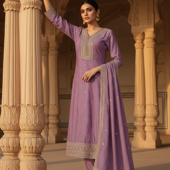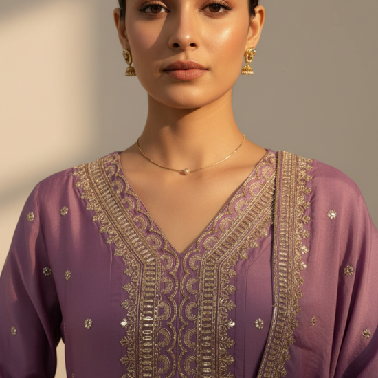 Made from Cotton, this suit with Sequence & Zari Threadwork is ready-to-wear for Formal Occasion. Dry Wash / Dry Clean advised.