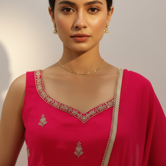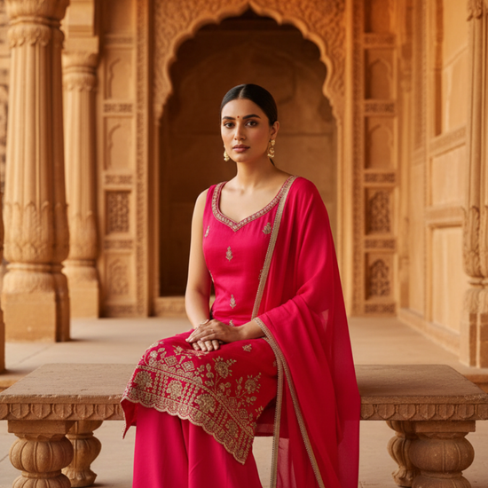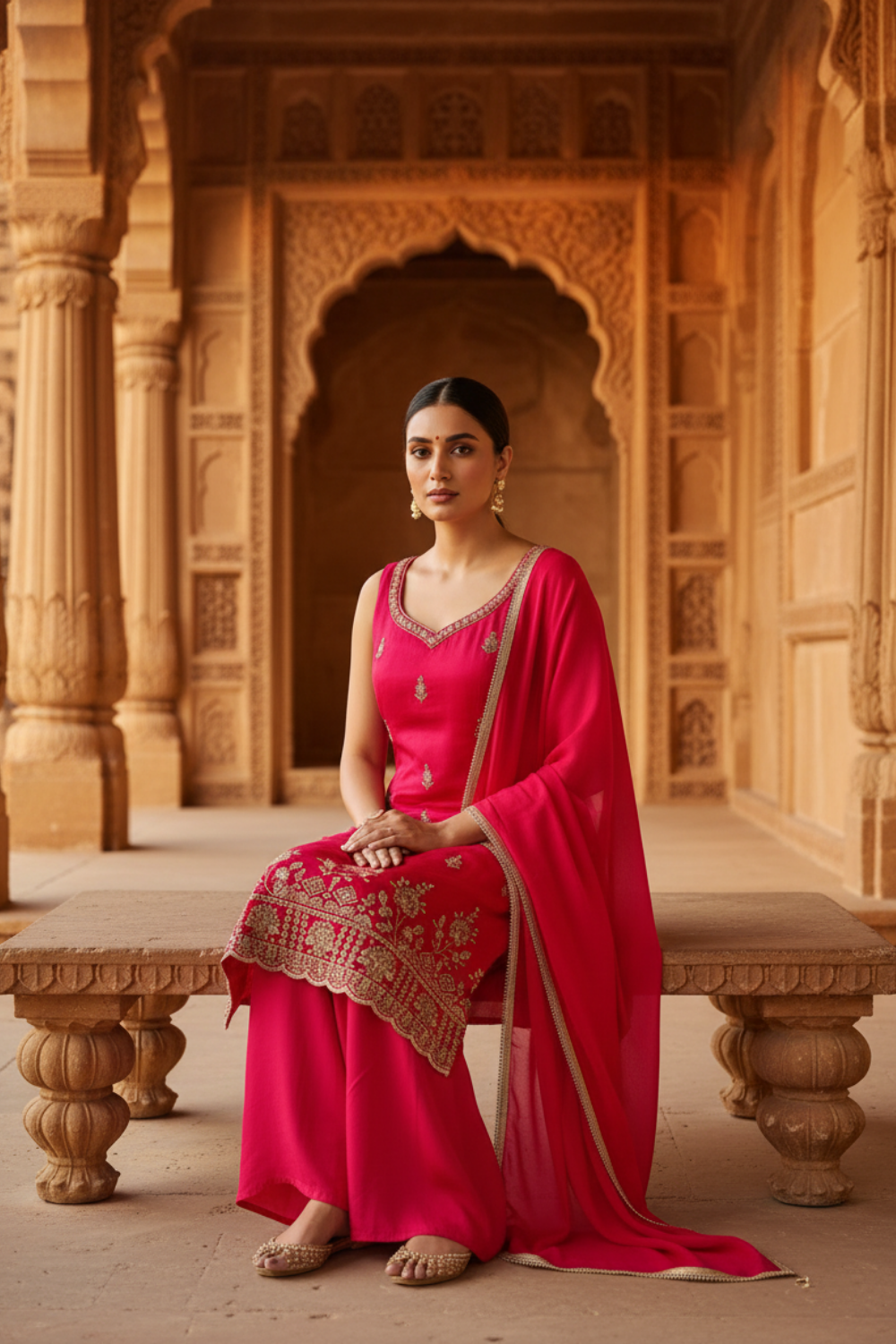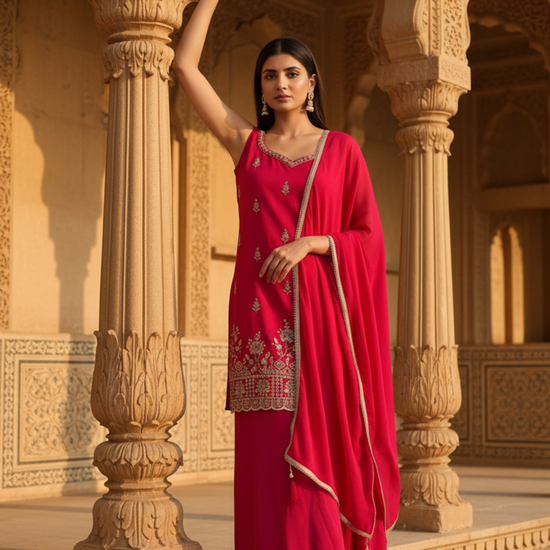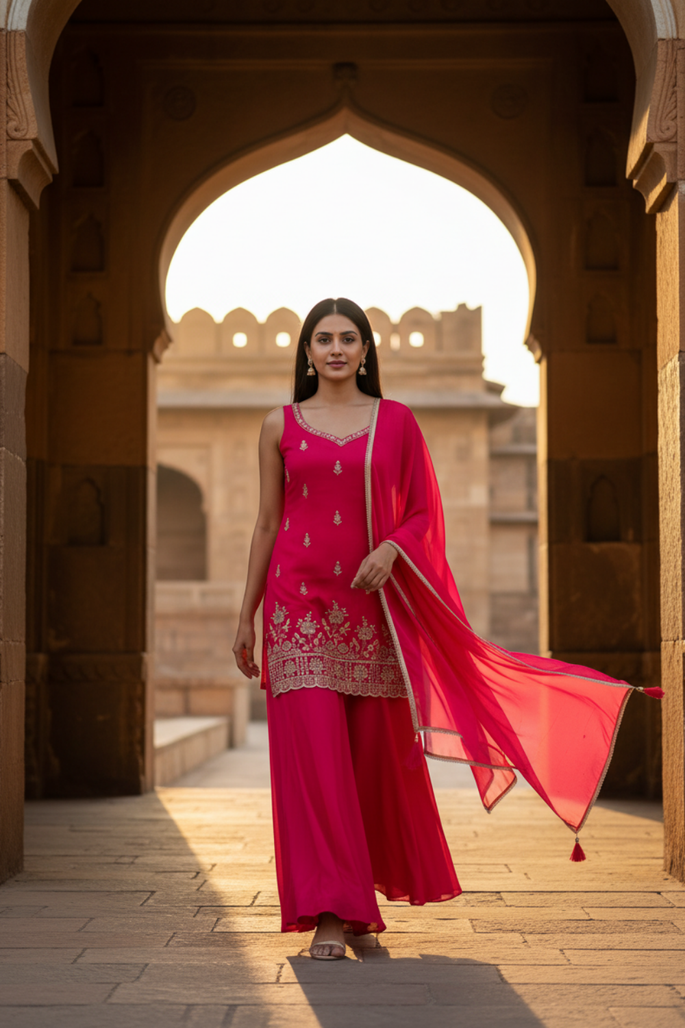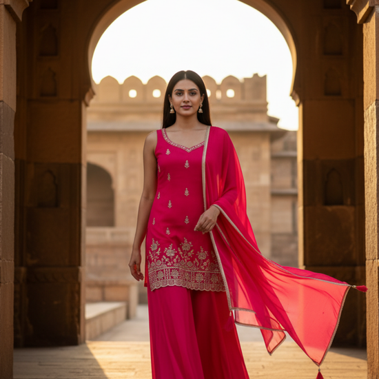 Panna Coral Crepe Readymade Sharara Set With Chinon Dupatta