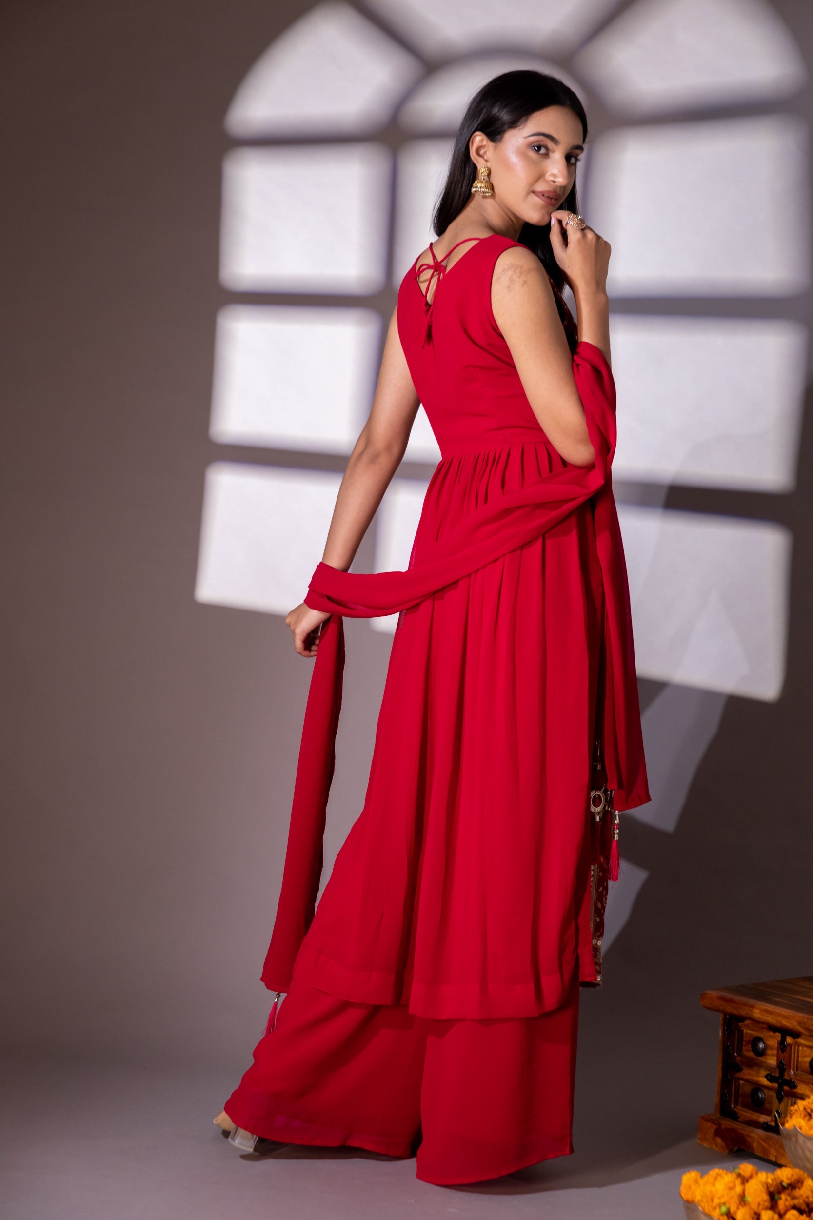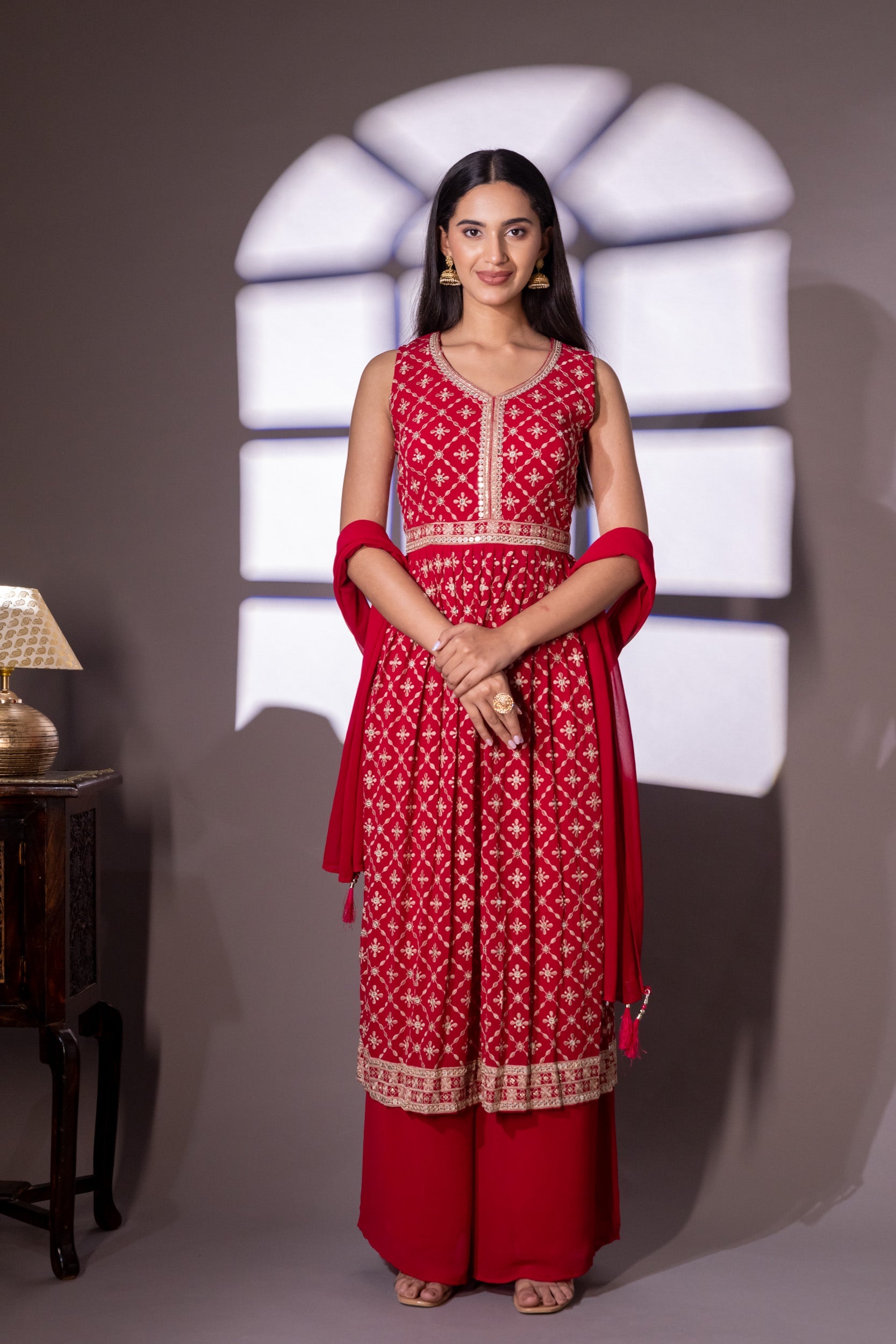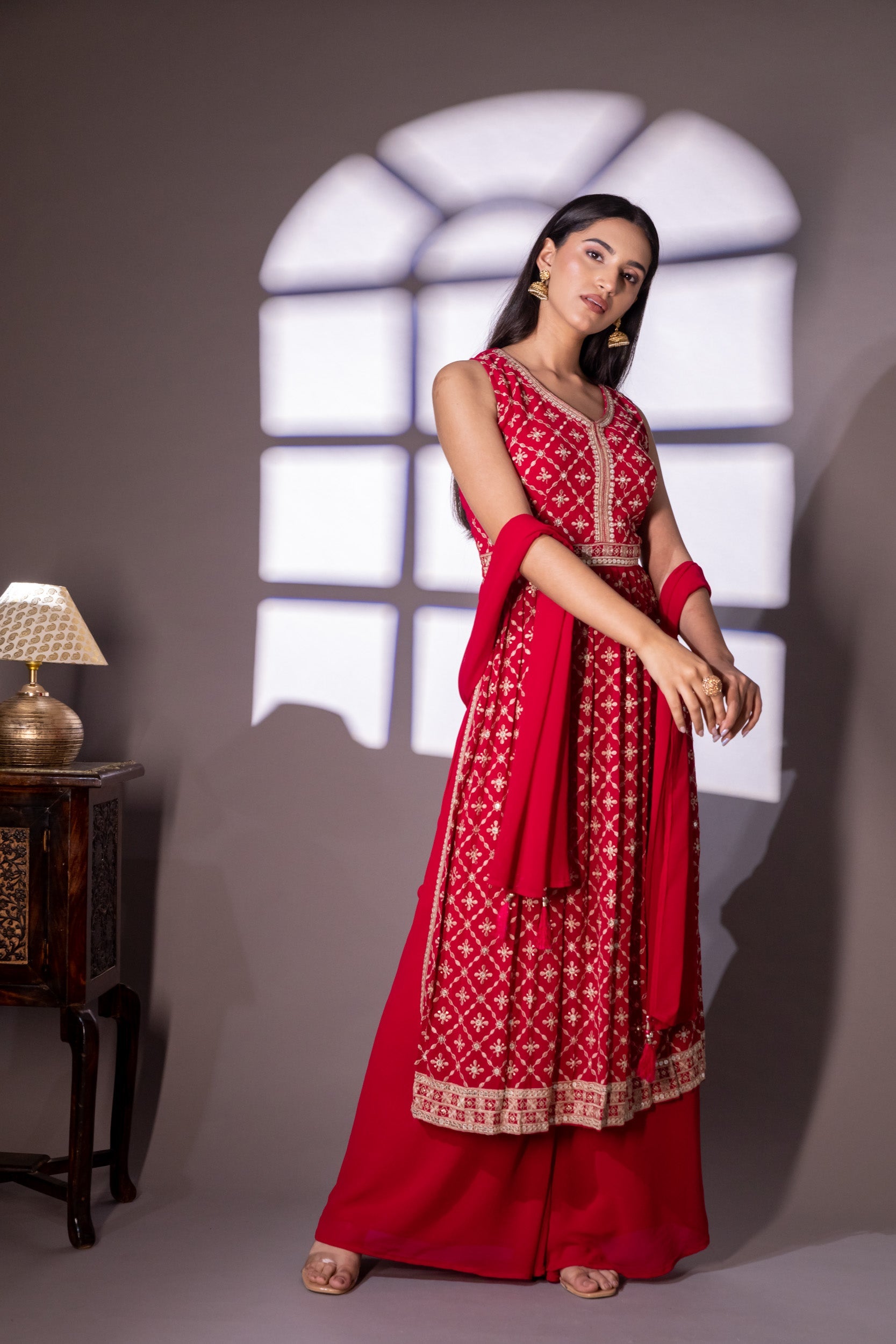 Panna Red Georgette Readymade Sharara Set With Georgette Dupatta