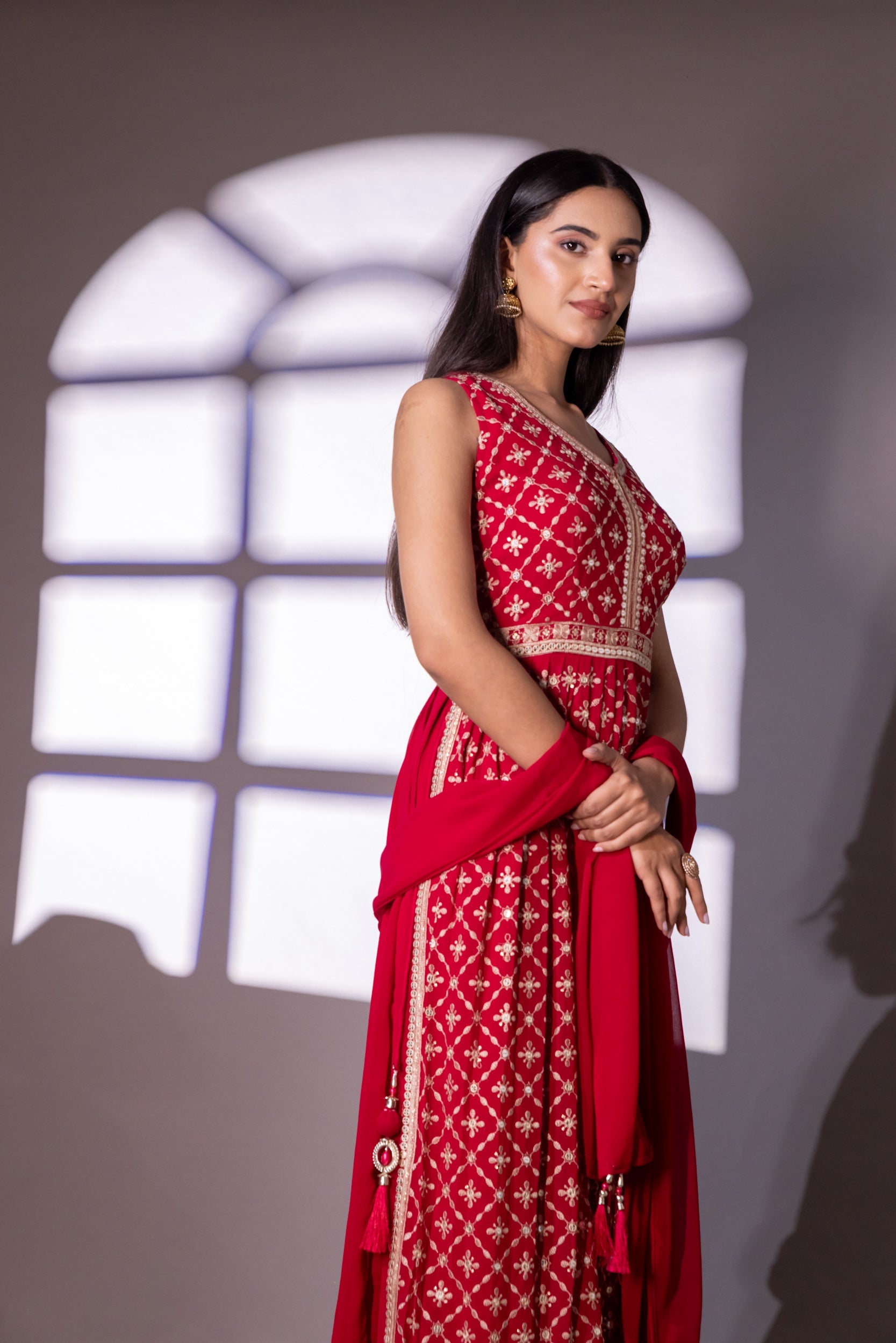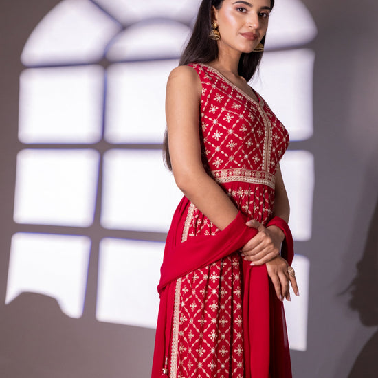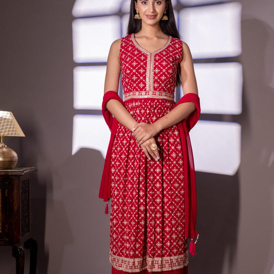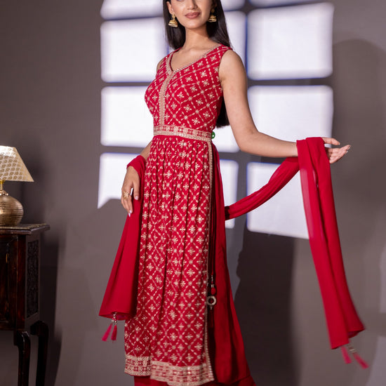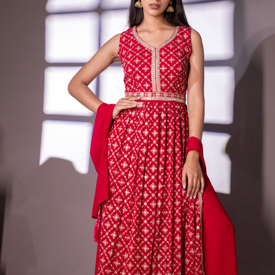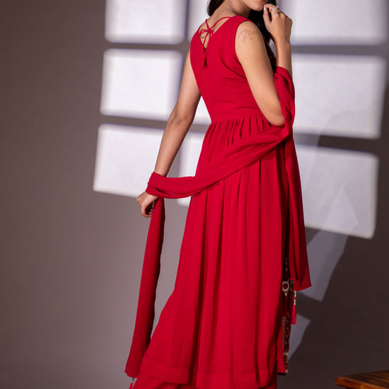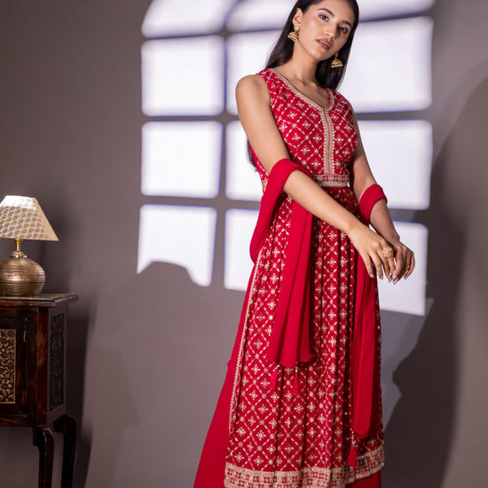 Panna Red Georgette Readymade Sharara Set With Georgette Dupatta