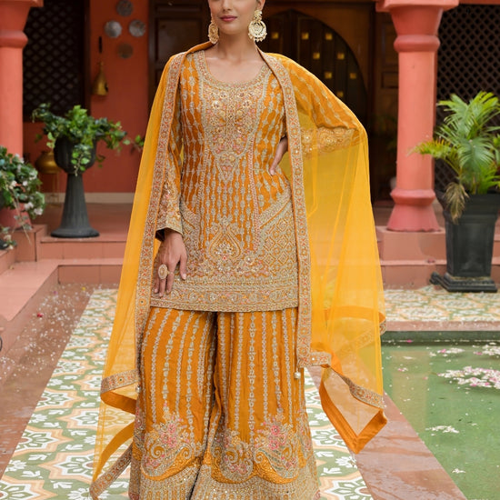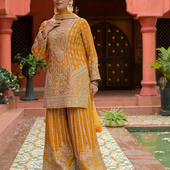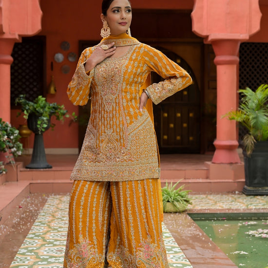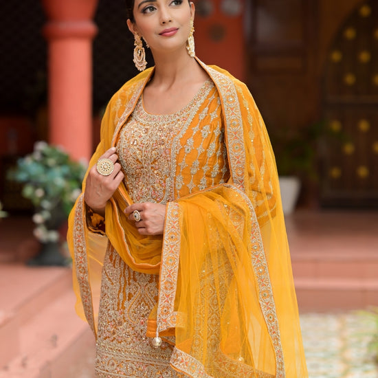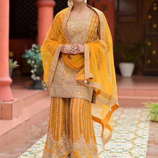 Panna Mustard Georgette Readymade Sharara Set With Net Dupatta