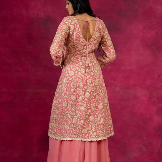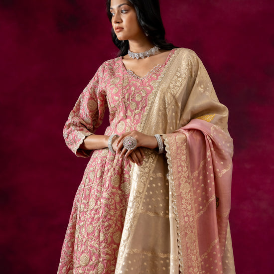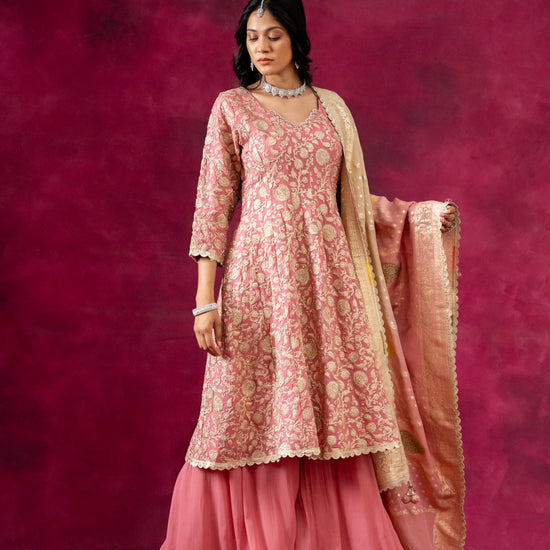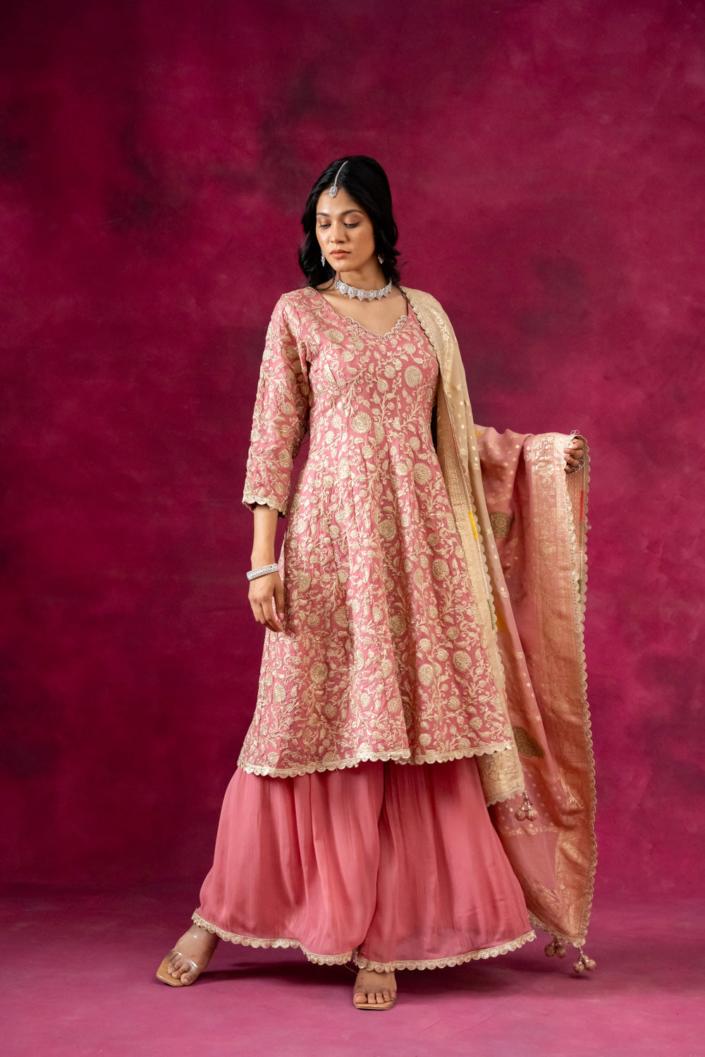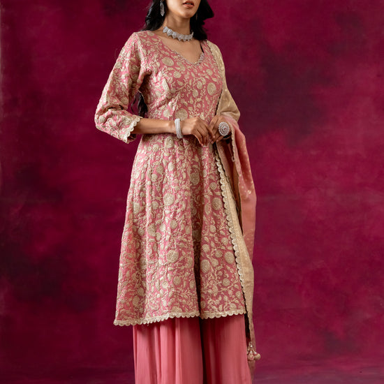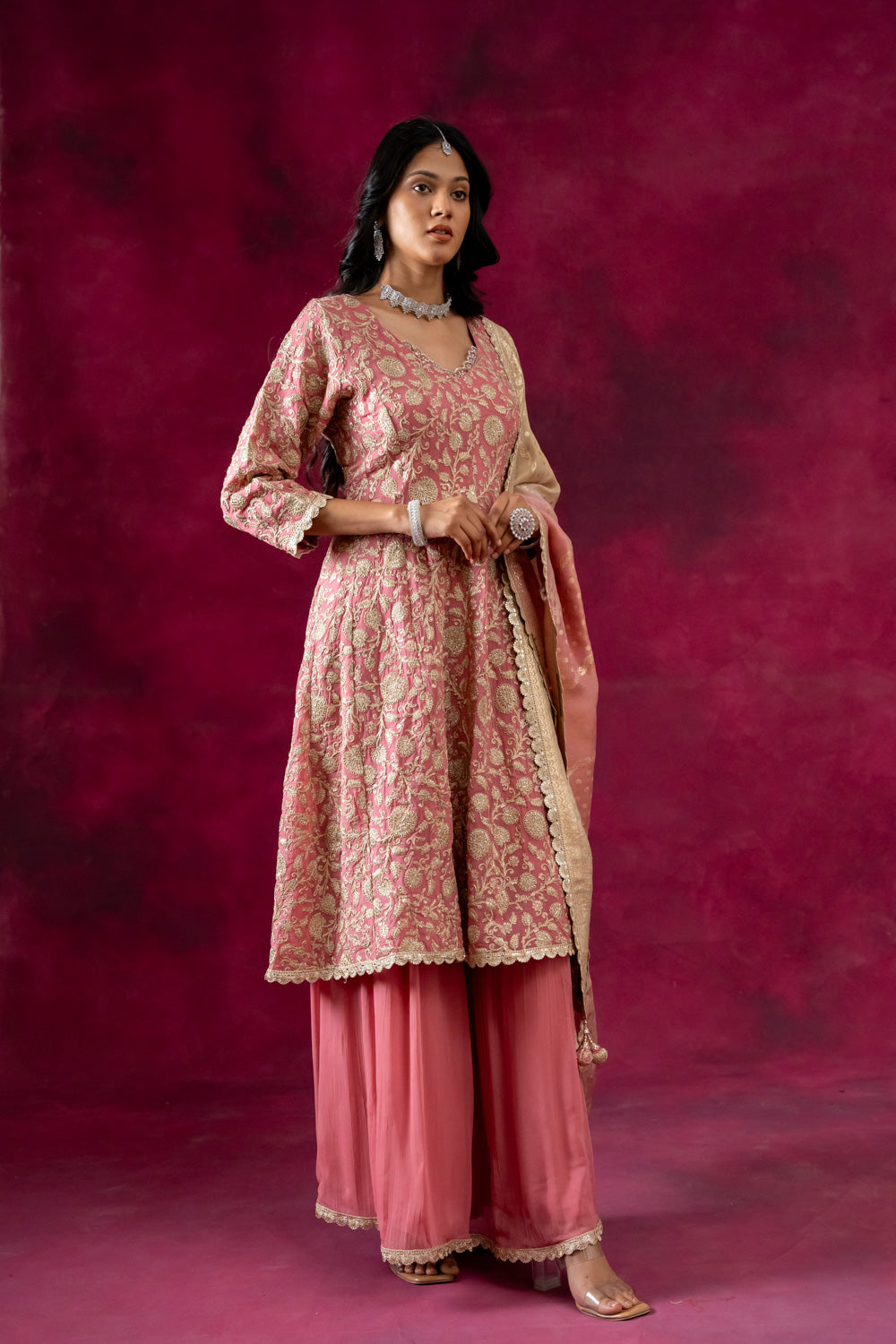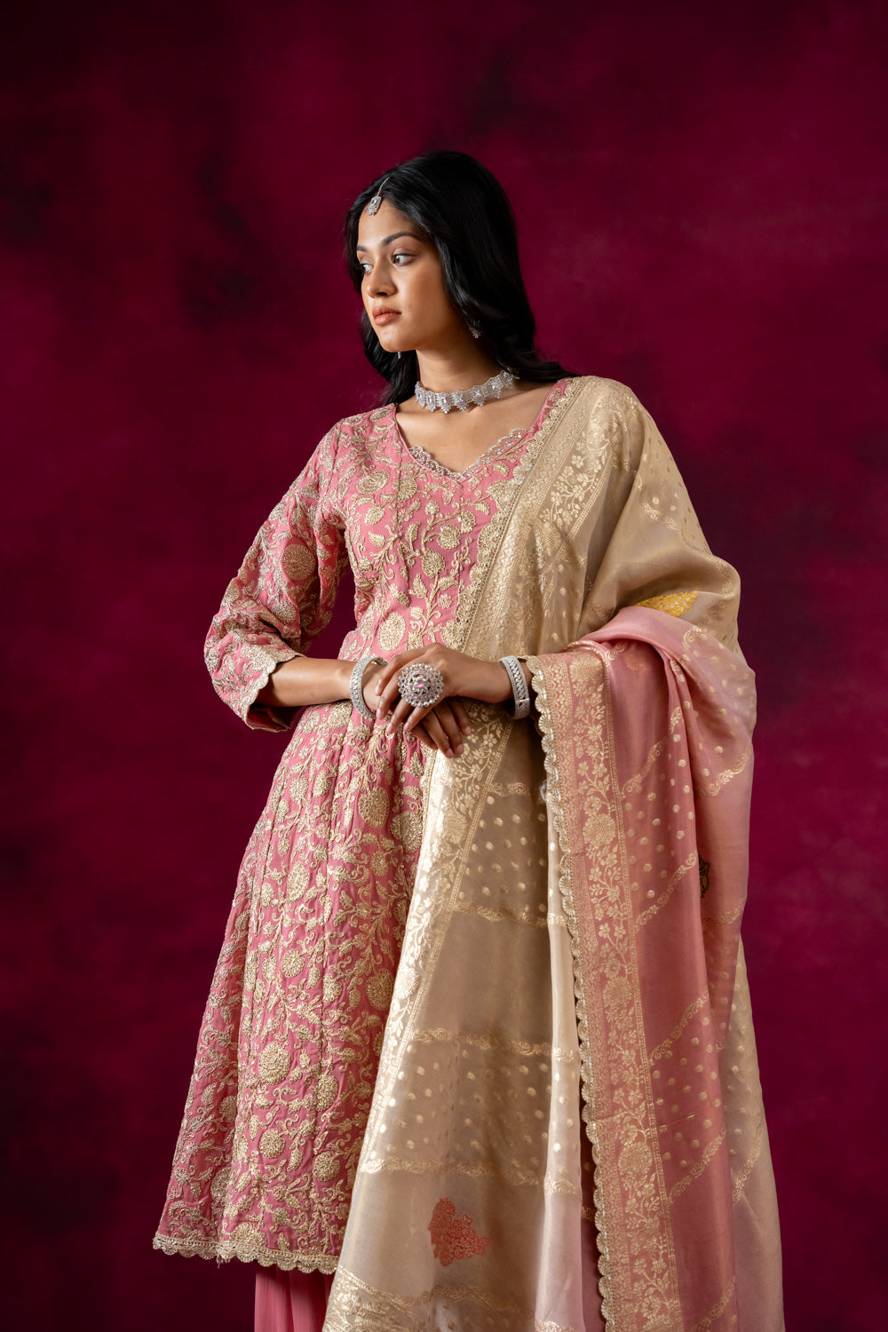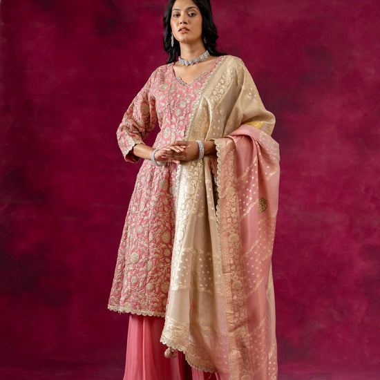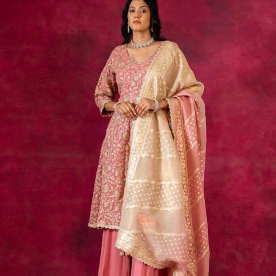Panna Gajari Georgette Readymade Suit And Palazzo With Banarasi Silk Dupatta