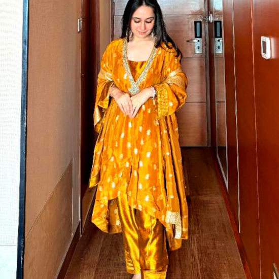 Designed with Cutdana, Sequence & Zari Work, this Organza ready-made suit is perfect for Formal Occasion. Its Light weight finish ensures effortless elegance. Dry Wash / Dry Clean recommended.