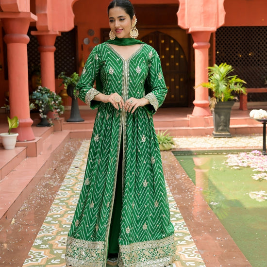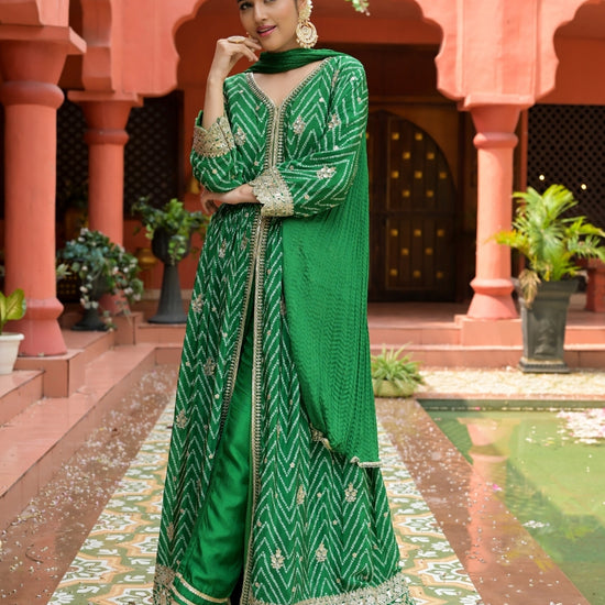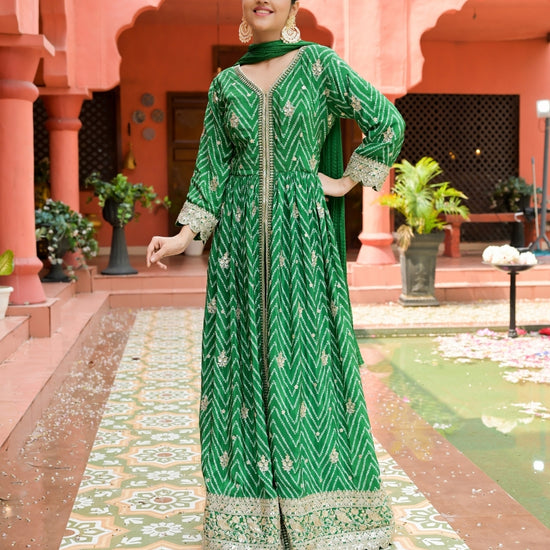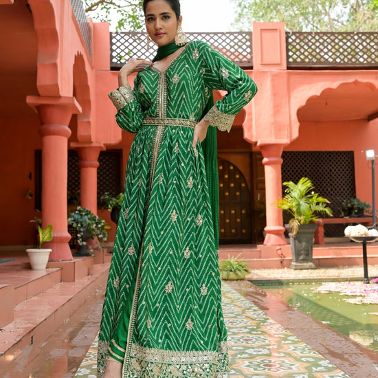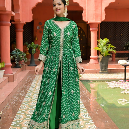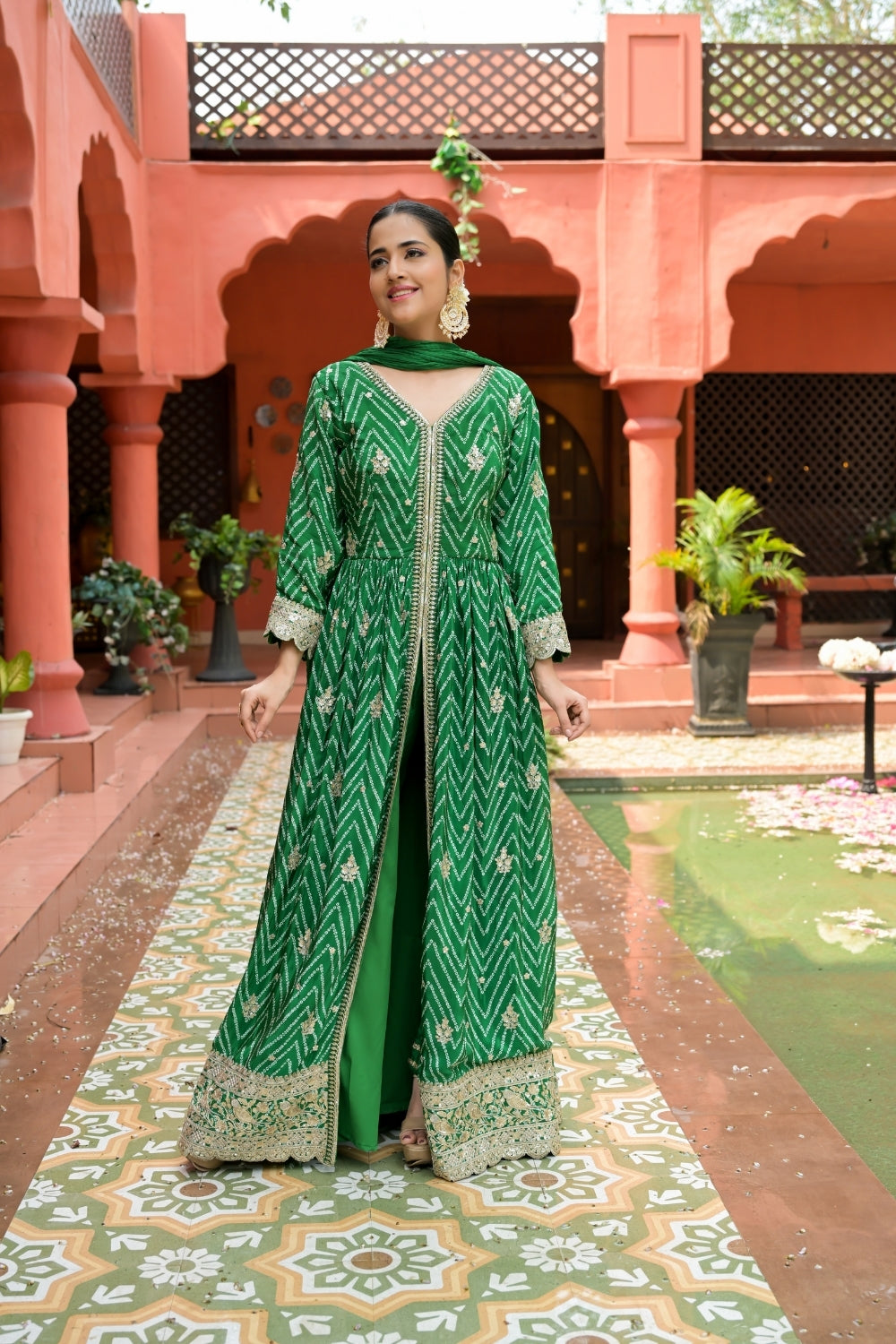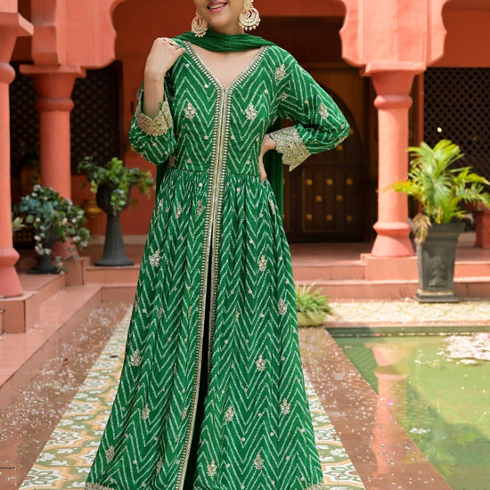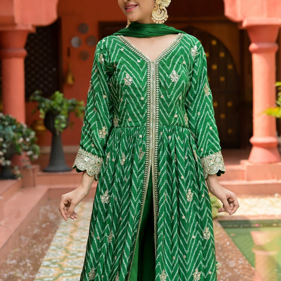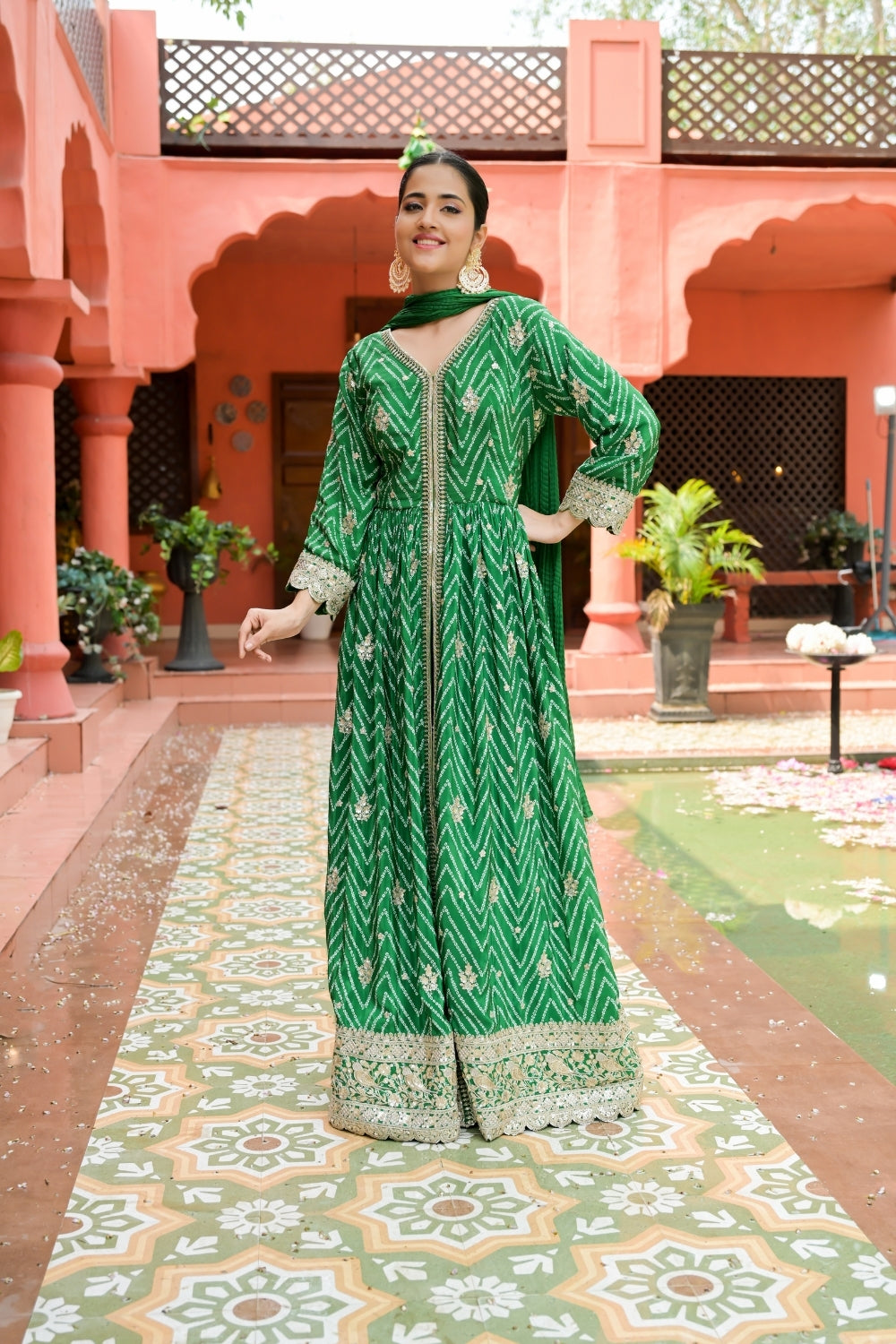 Panna Bottle Green Sequence, Zari Threadwork & Bandhini Printed Crepe Readymade Suit And Pant With Chinon Dupatta