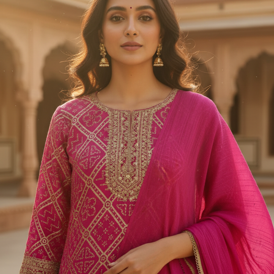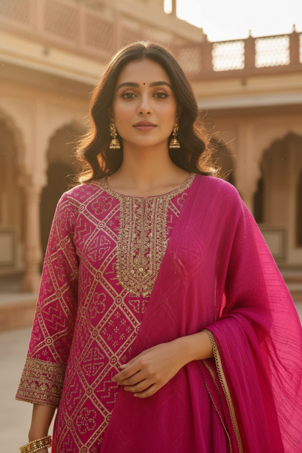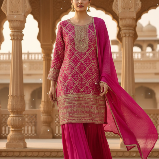Timeless Elegance Rani Crepe Readymade Suit And Plazzo With Chinon Dupatta