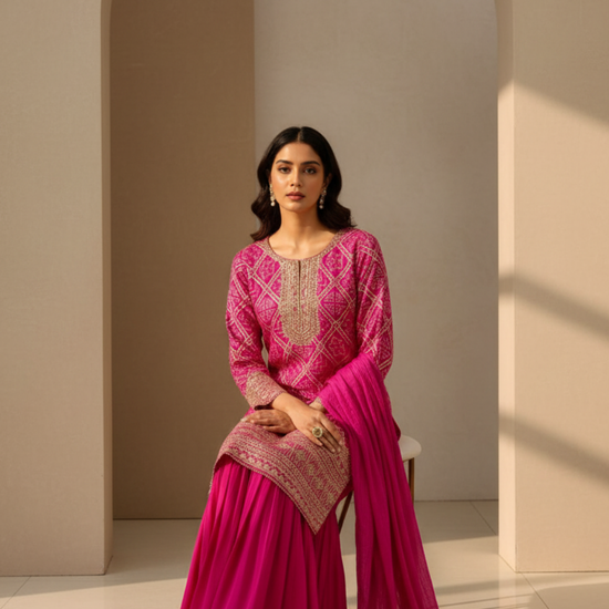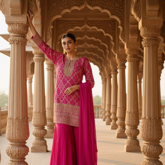 Timeless Elegance Rani Crepe Readymade Suit And Plazzo With Chinon Dup – The Panna Shop