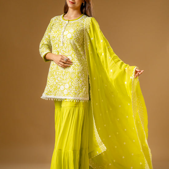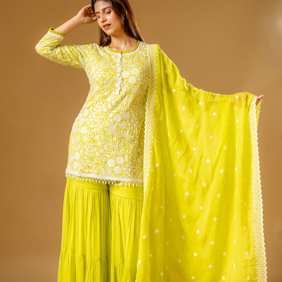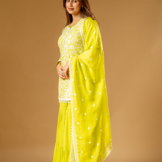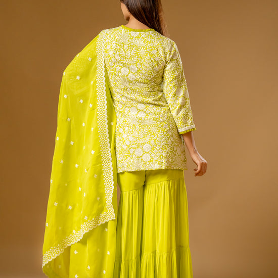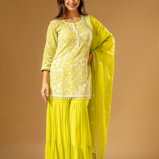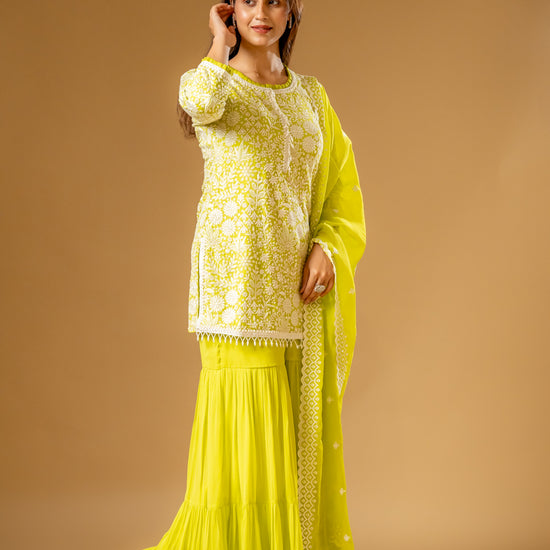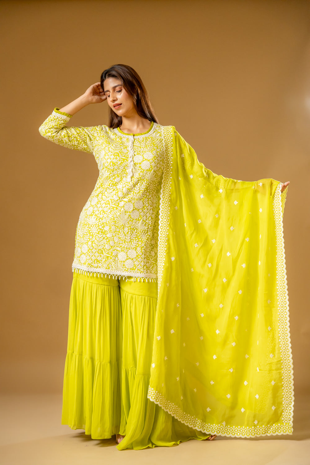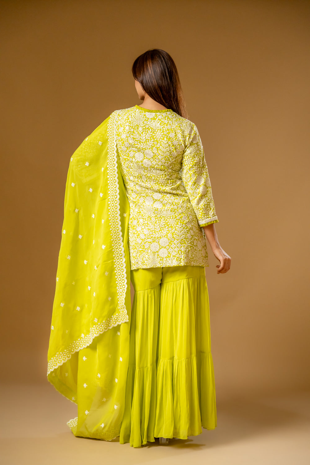 Panna Pista Georgette Readymade Sharara Set With Organza Dupatta