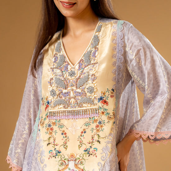 Featuring Cutdana, Floral Print, Sequence & Threadwork, this Crepe suit is crafted for Formal Occasion. Its Color Variations and pre-stitching make it a go-to option. Dry Wash / Dry Clean recommended.