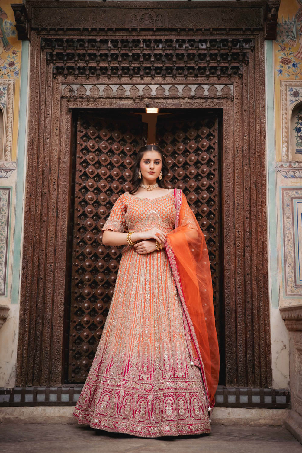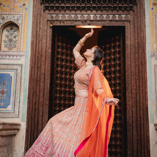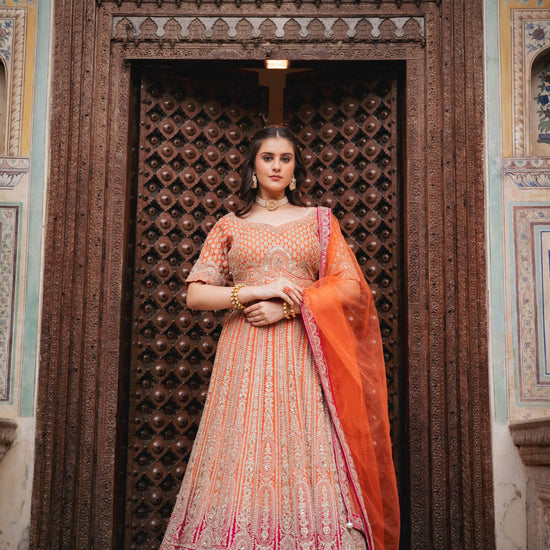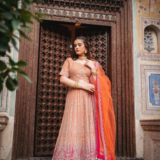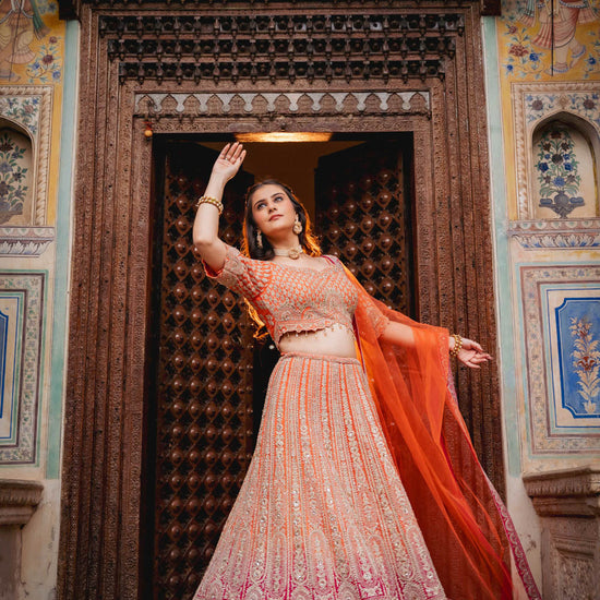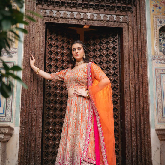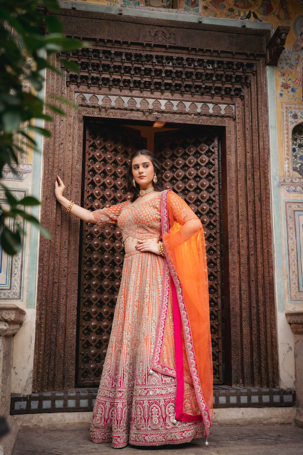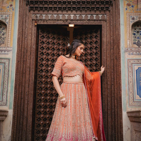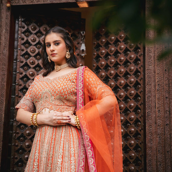 Panna Orange Rani Net Lehenga Set And Net Dupatta With Readymade Blouse