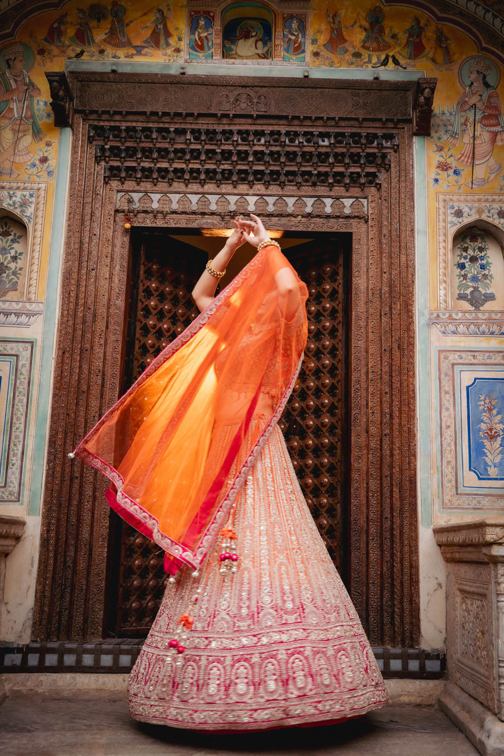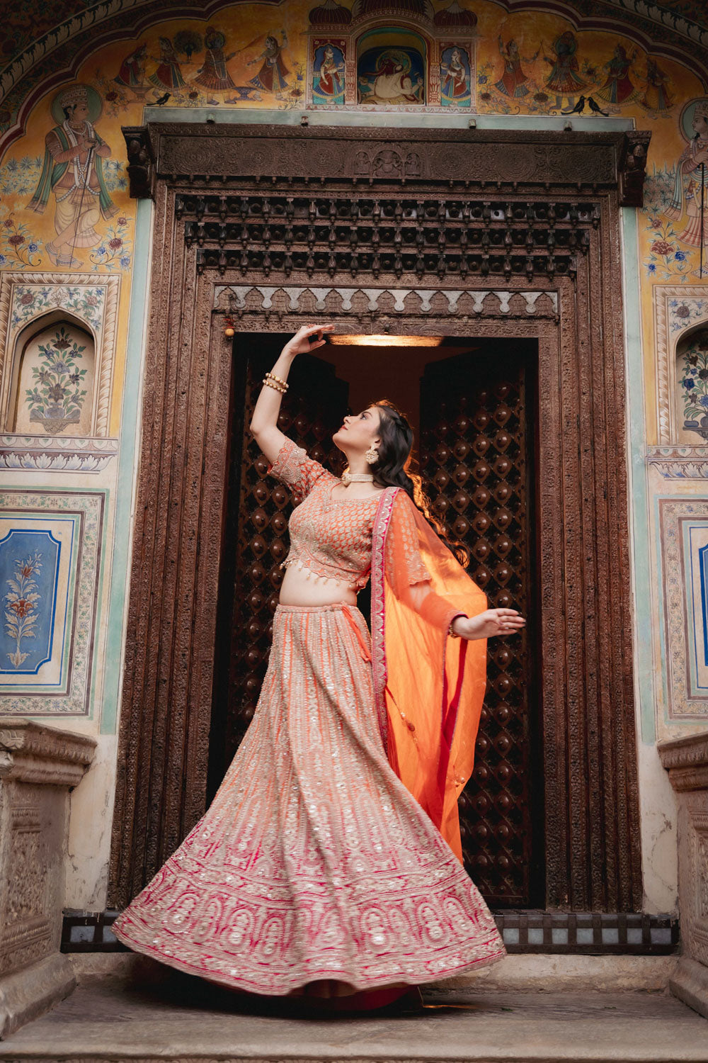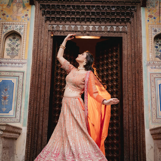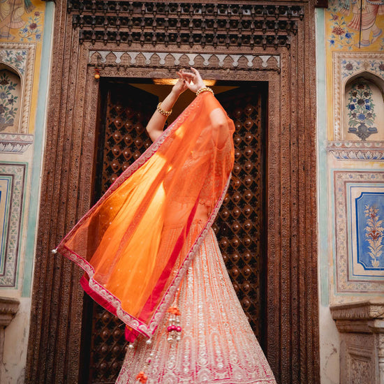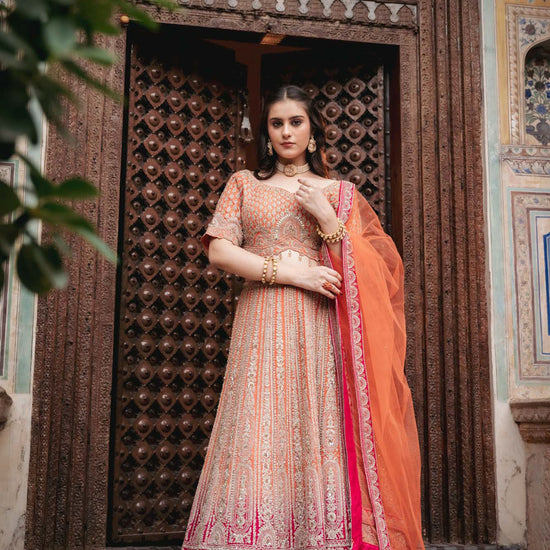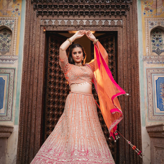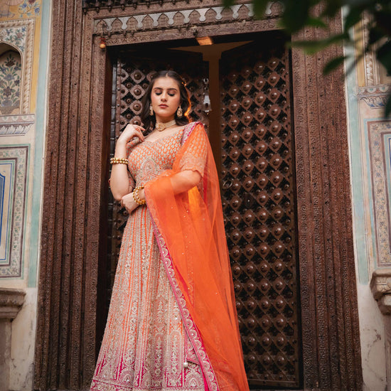 Panna Orange Rani Net Lehenga Set And Net Dupatta With Readymade Blouse