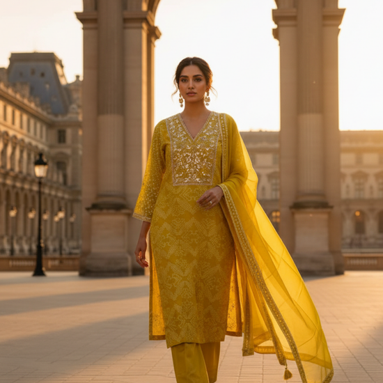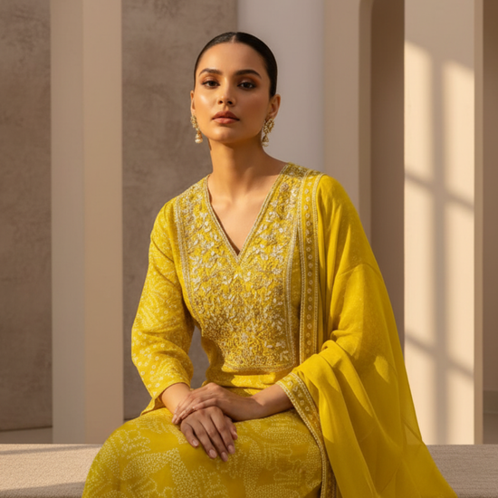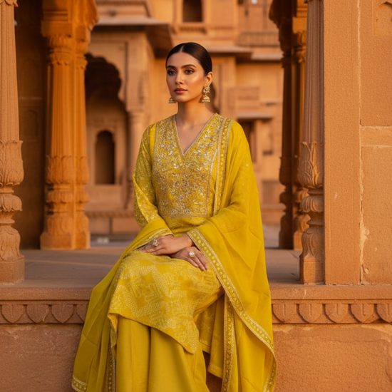 Panna Radiate Glamour Lemon Gold Dola Readymade Suit And Plazzo With Tissue Dupatta