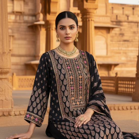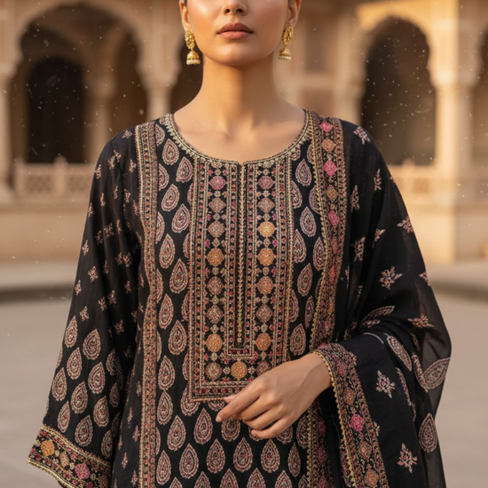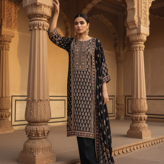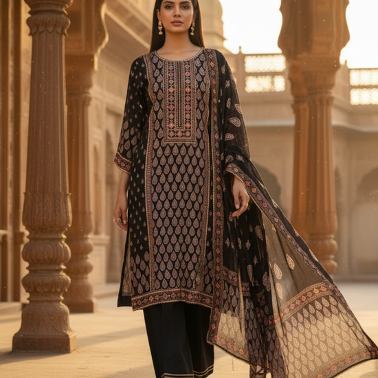 Panna Bold Statement Black Tissue Readymade Suit And Pant With Chinon Dupatta