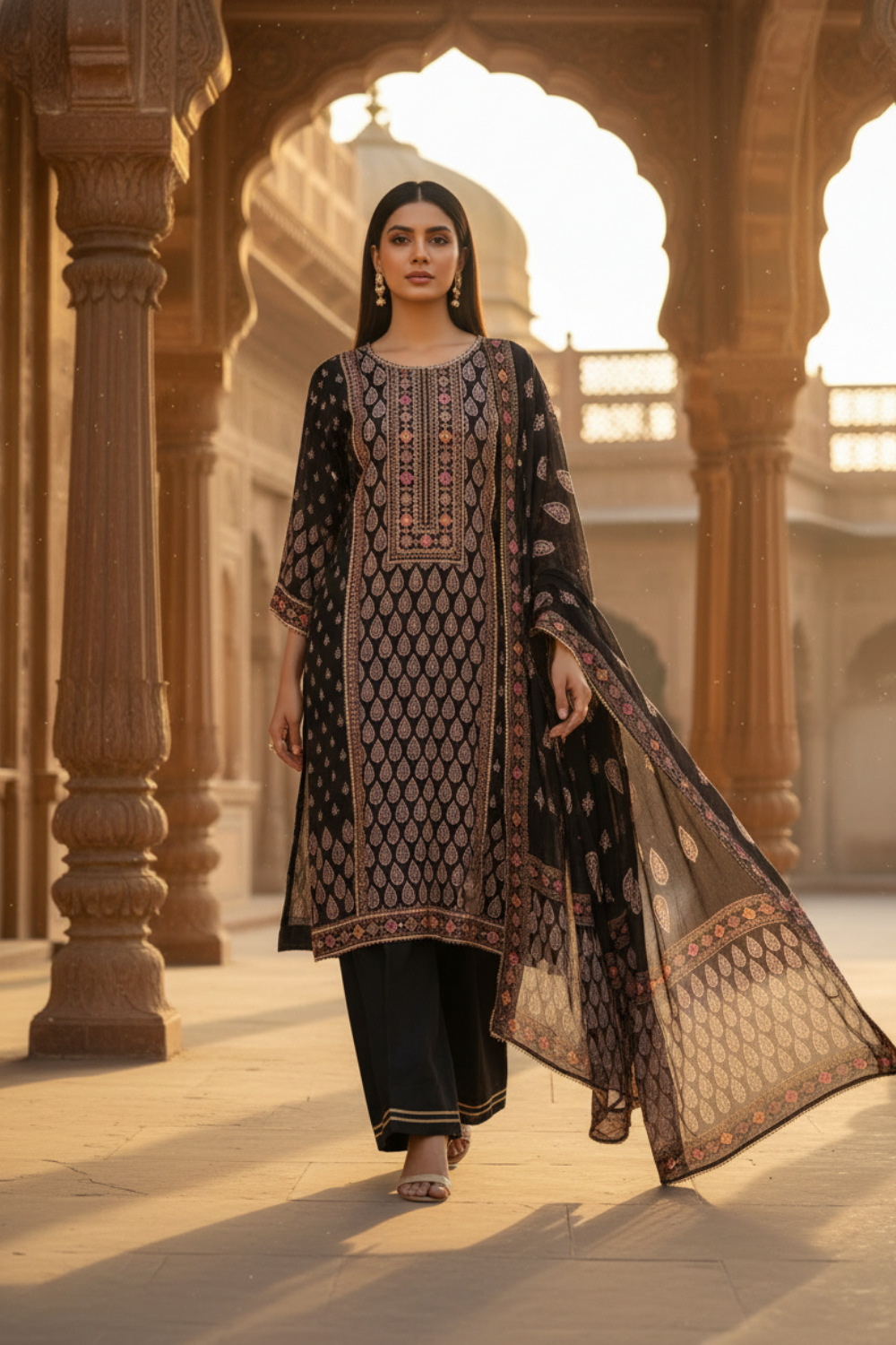 Drape yourself in understated luxury with this readymade suit crafted from exquisite Tissue fabric, known for its delicate sheen and graceful texture. The ensemble features a striking Digital Print, beautifully enhanced with Bead work, Dabka detailing, Mirror accents, shimmering Sequence work, and radiant Swarovski embellishments. Every element reflects fine craftsmanship and modern opulence, making this outfit perfect for weddings, festive occasions, and grand celebrations. A true blend of tradition and contemporary glamour, this suit embodies elegance in every detail.