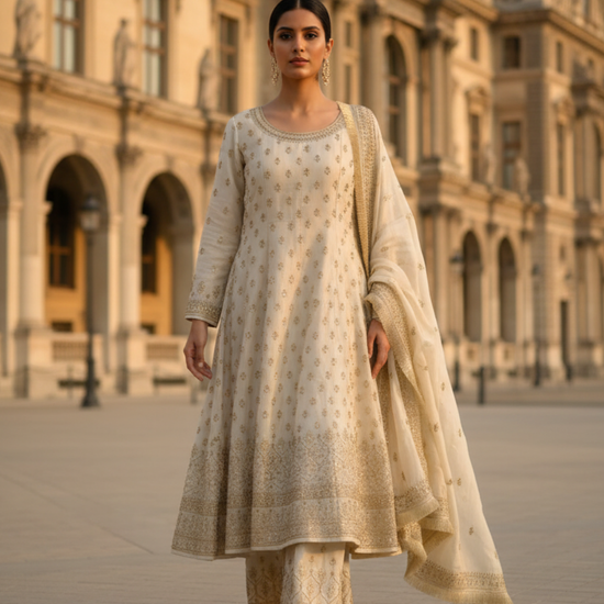 Match with : Embroidered juttis, mojris, or block heels in gold or nude tones.