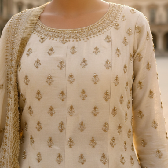 Step into regal elegance with this readymade Sharara crafted from rich Tissue fabric, prized for its luminous sheen and graceful drape. The ensemble is intricately embellished with Bead work, Cutdana work, Dabka detailing, sparkling Sequence accents, exquisite Zari Thread embroidery, and dazzling Zarkan embellishments, creating a look of timeless grandeur. Perfect for weddings, festive celebrations, and grand occasions, this outfit beautifully blends traditional craftsmanship with modern sophistication — a true statement of luxury and elegance.