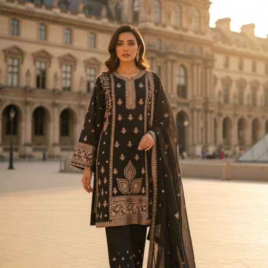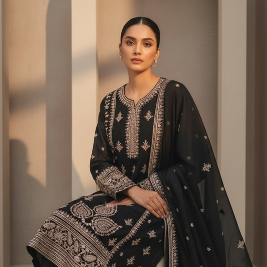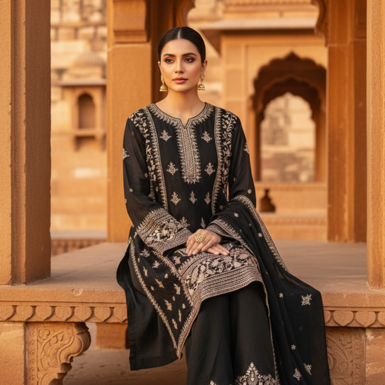 Panna Bold Statement Black Chinon Readymade Sharara Set With Chinon Dupatta