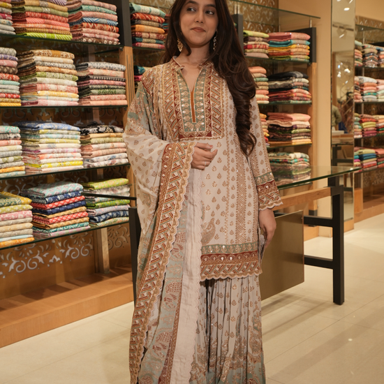Panna Tussar Crepe Readymade Sharara Set With Crepe Dupatta (Ft:-Muskan Sharma)