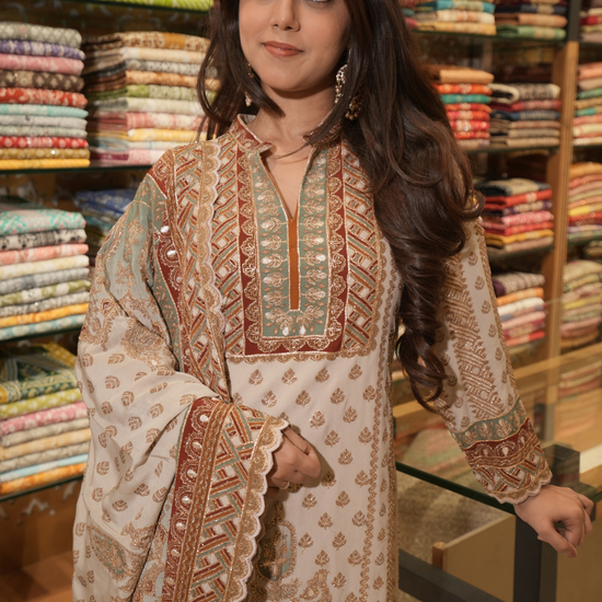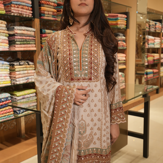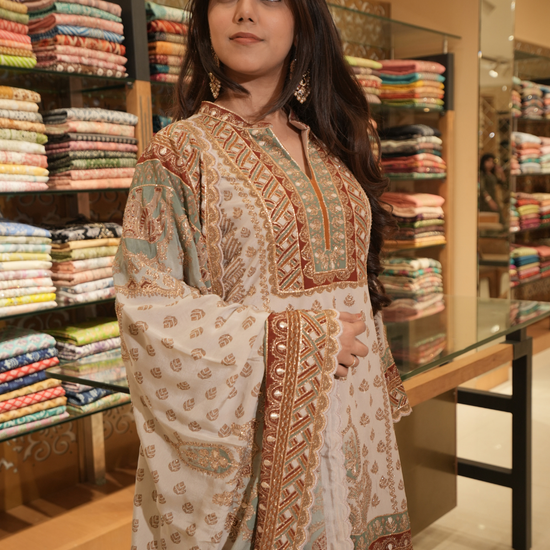Crafted from Crepe, this ready-made suit features Digital Print, Gotta Patti, Swarovski & Zari and is perfect for Formal Occasion. Its Lightweight design ensures comfort and style. Follow Dry Wash / Dry Clean.