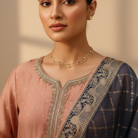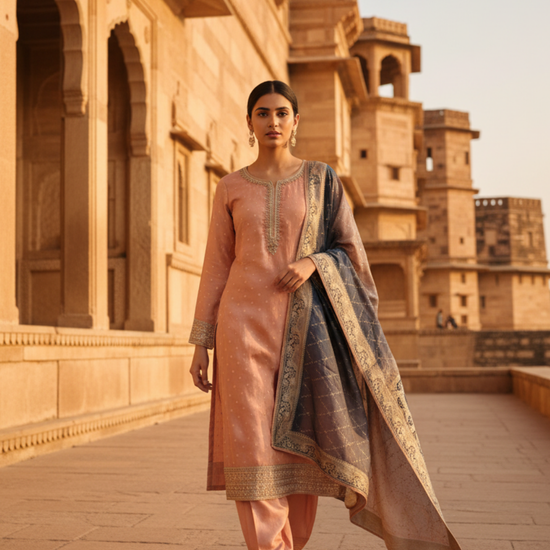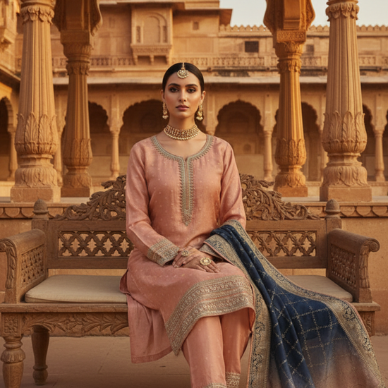 Crafted from Dola, this ready-made suit features Banarasi Woven Zari, Bead, Cutdana, Dabka, Sequence & Zari Threadwork and is perfect for Formal Occasion. Follow Dry Wash / Dry Clean.