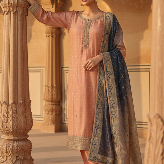 Panna Peach Dola Readymade Suit And Pant With Organza Dupatta