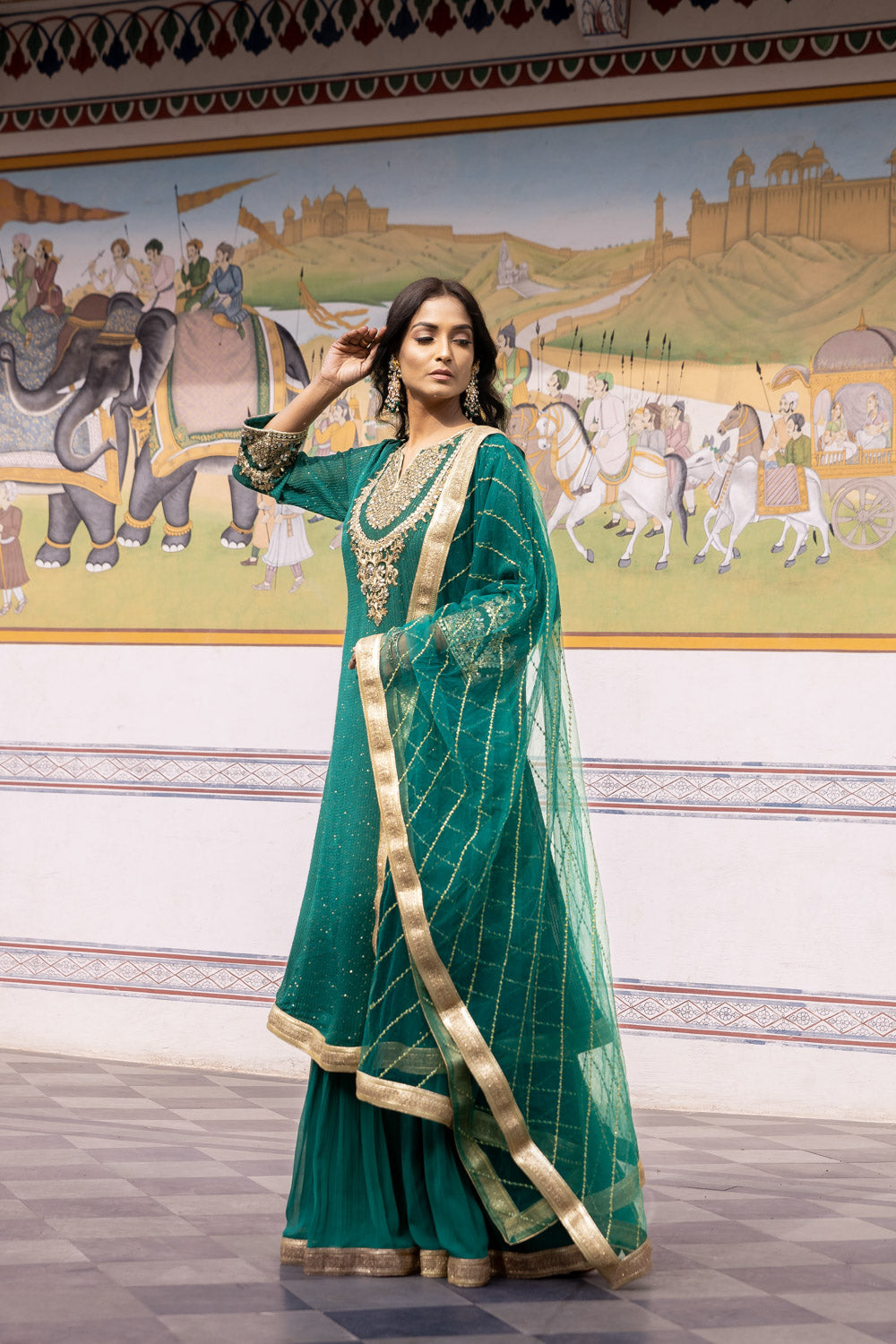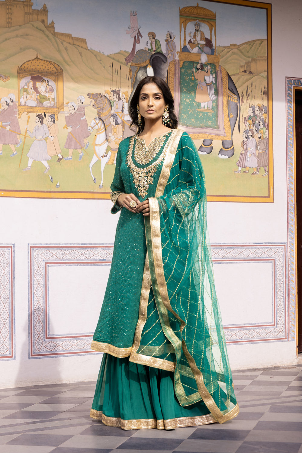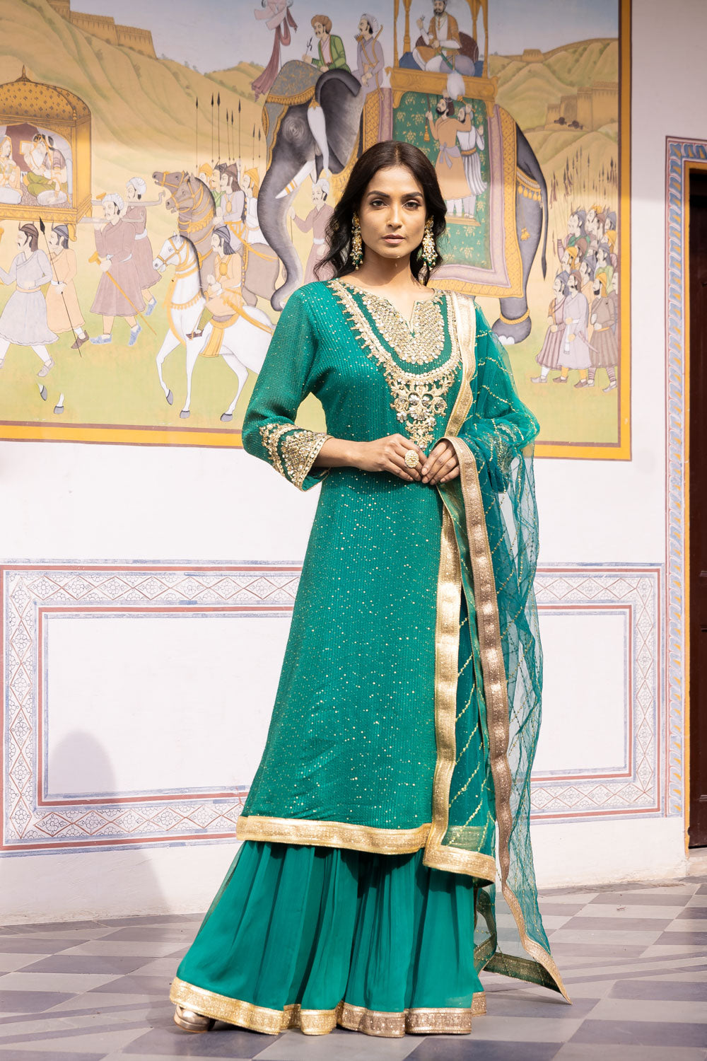 Panna Rama Georgette Readymade Sharara Set With Net Dupatta