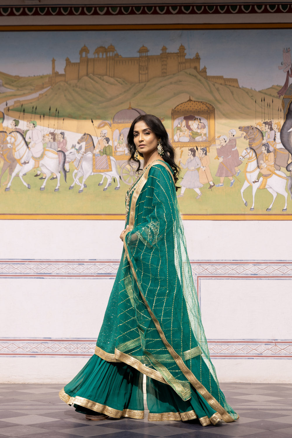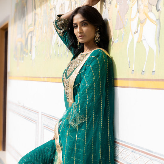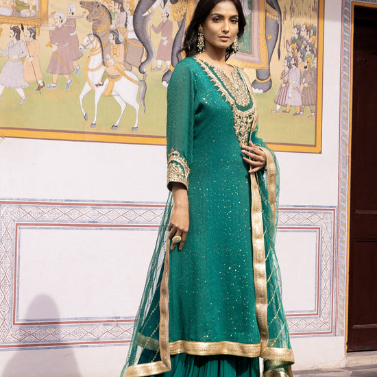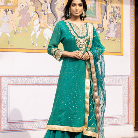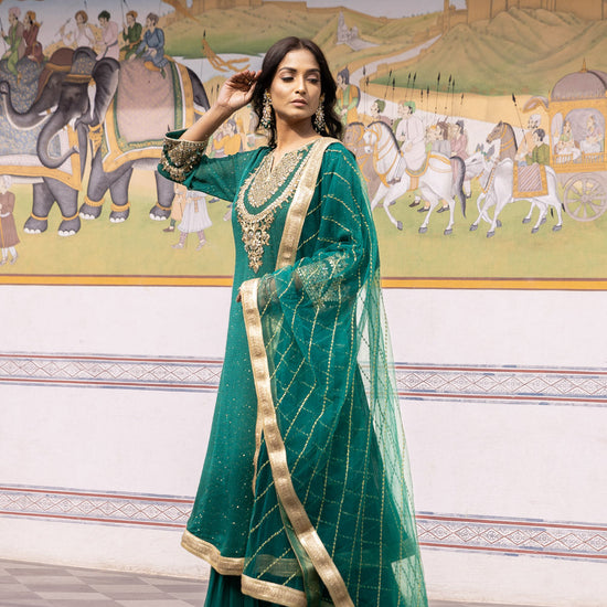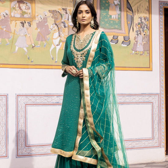 Panna Rama Georgette Readymade Sharara Set With Net Dupatta