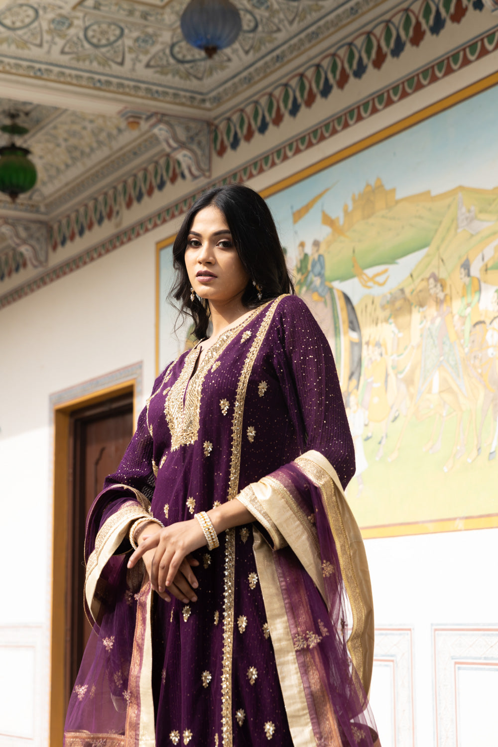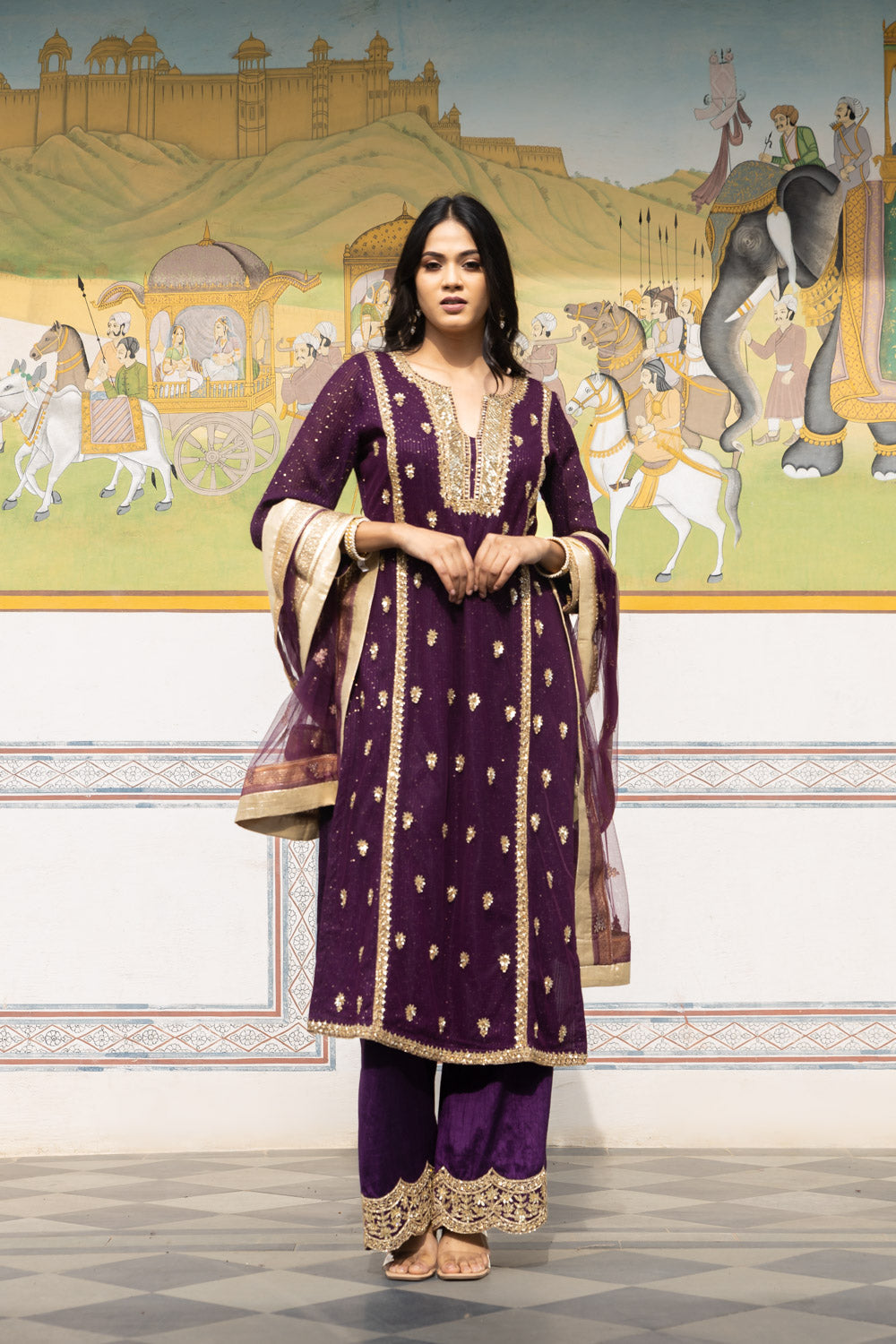 Panna Wine Georgette Readymade Suit With Net Dupatta
