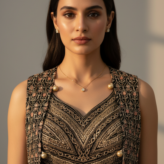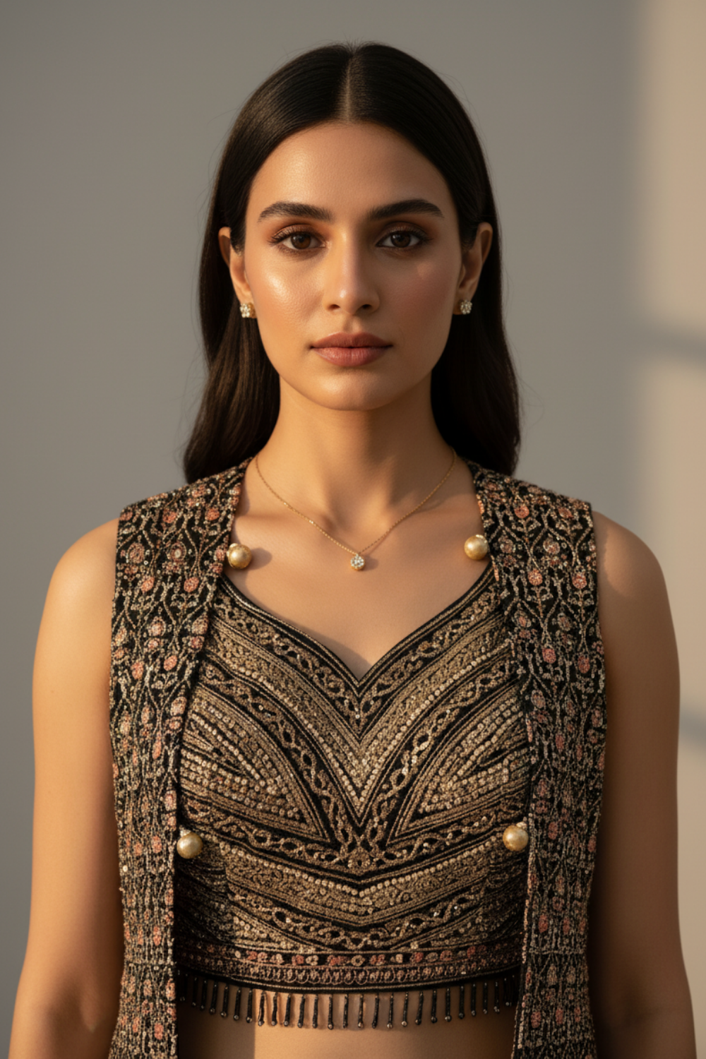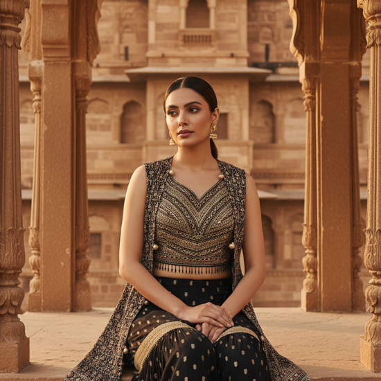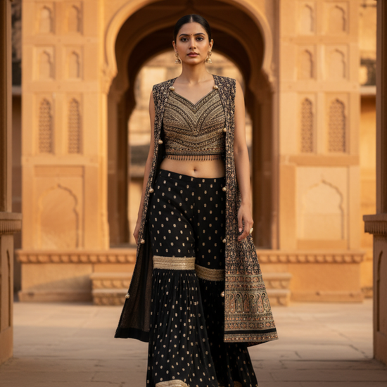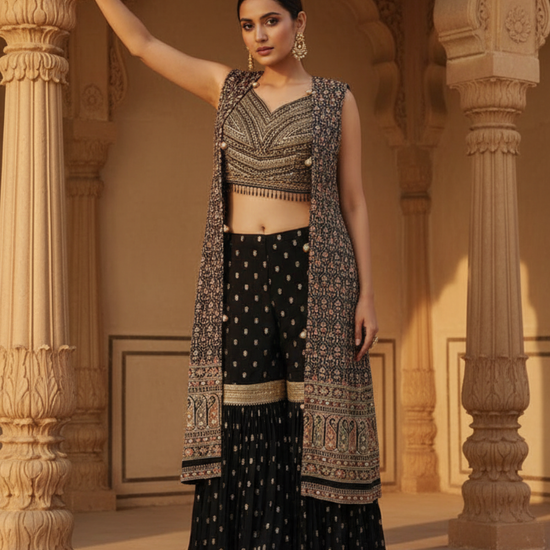 Black Georgette Short Top Sharara Set With Shrug – The Panna Shop