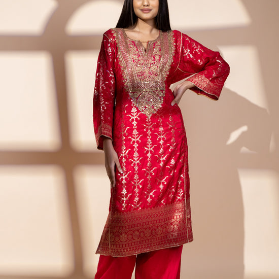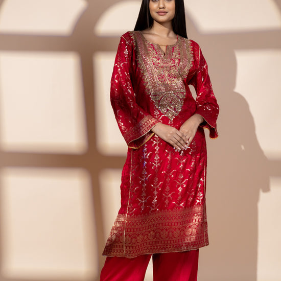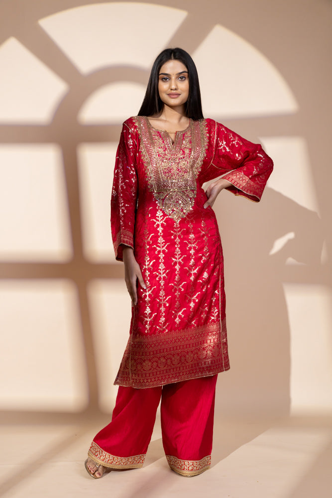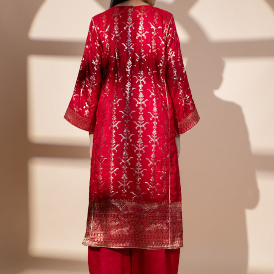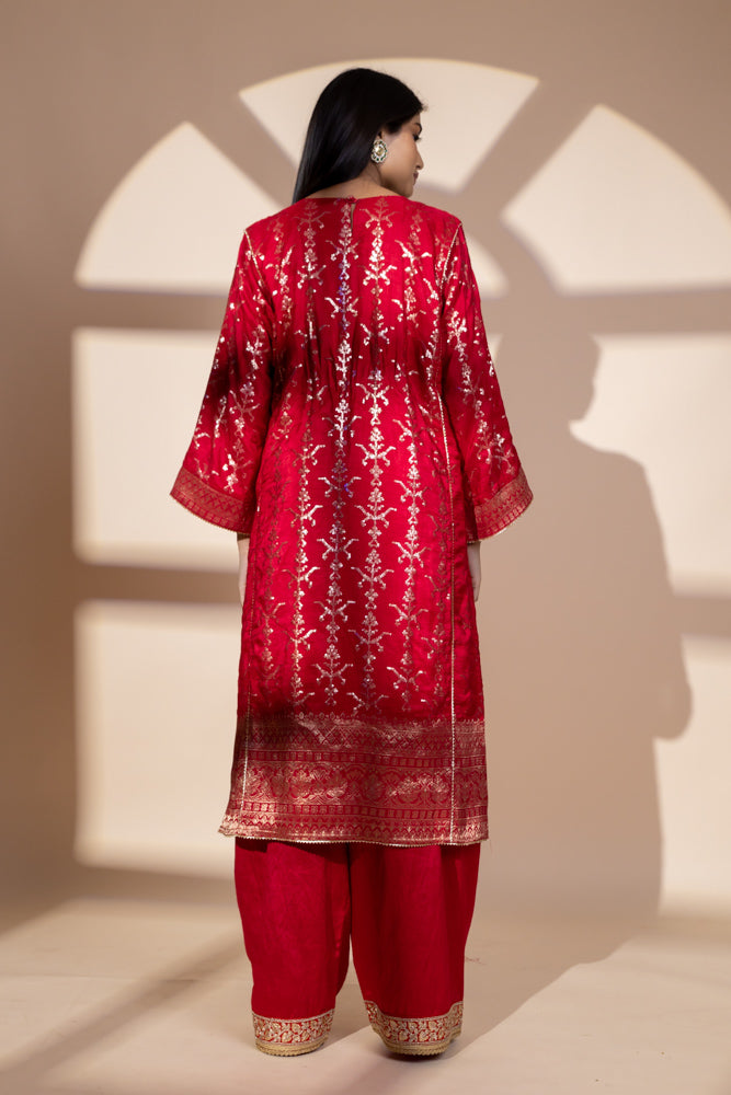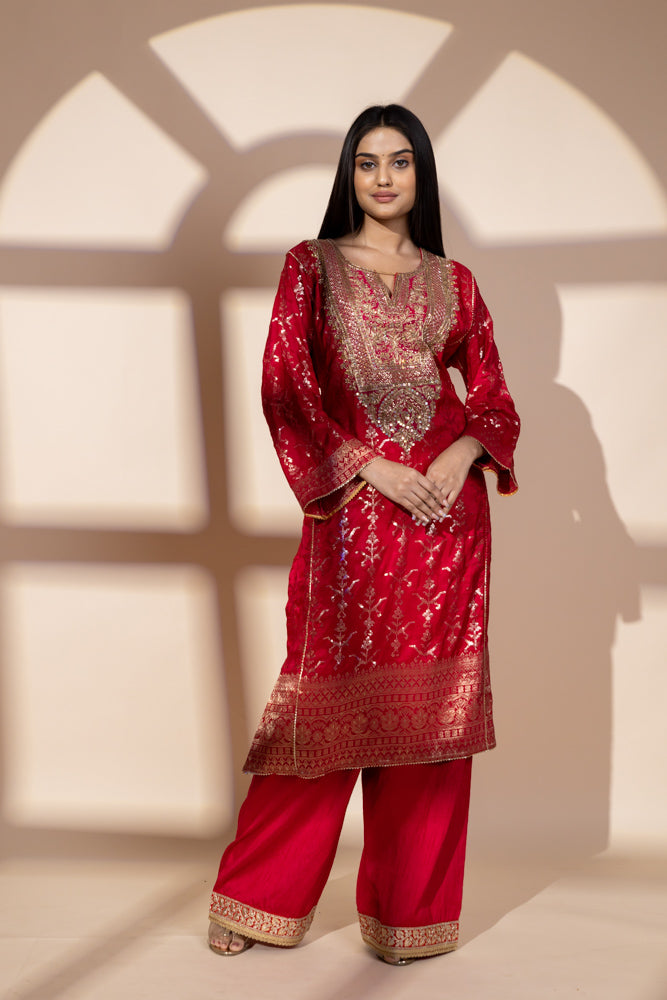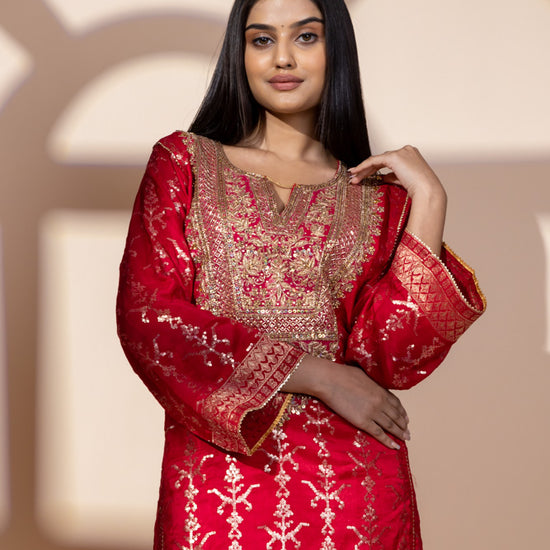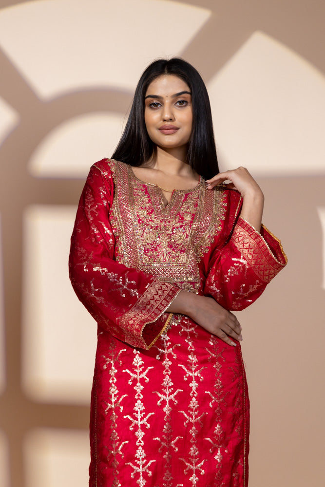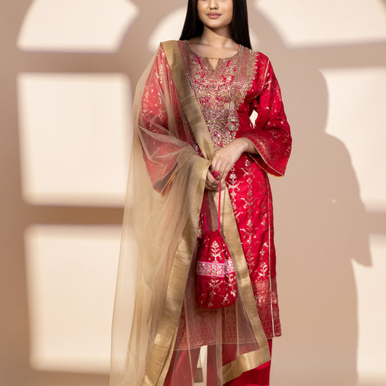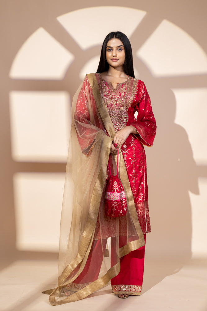 Panna Red Dolna Readymade Suit And Net Dupatta With Potli