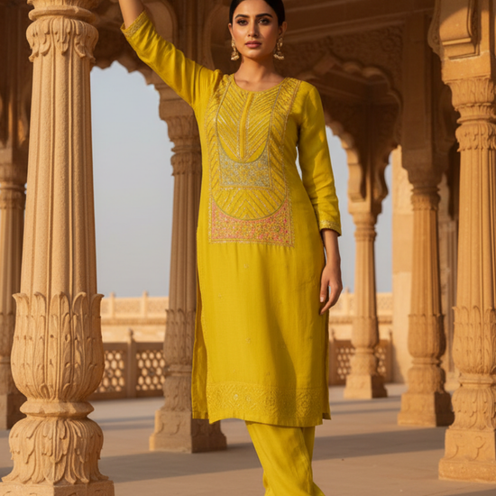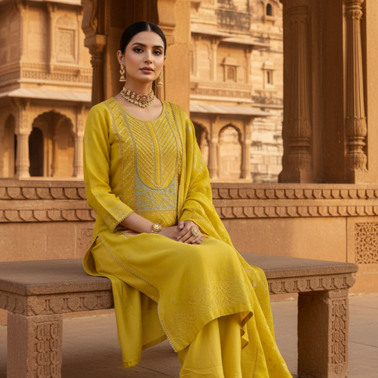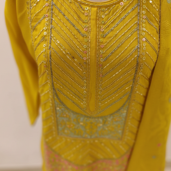Exude timeless elegance with this readymade suit crafted from luxurious Dolna fabric, admired for its smooth texture and elegant drape. The ensemble is exquisitely embellished with Bead work, Cutdana detailing, Mirror accents, shimmering Sequence work, delicate Thread embroidery, Woven Zari, and intricate Zari Thread work, reflecting impeccable craftsmanship and refined sophistication. Perfect for festive occasions, weddings, and grand celebrations, this outfit beautifully blends traditional artistry with a touch of modern glamour — a true statement of ethnic luxury.